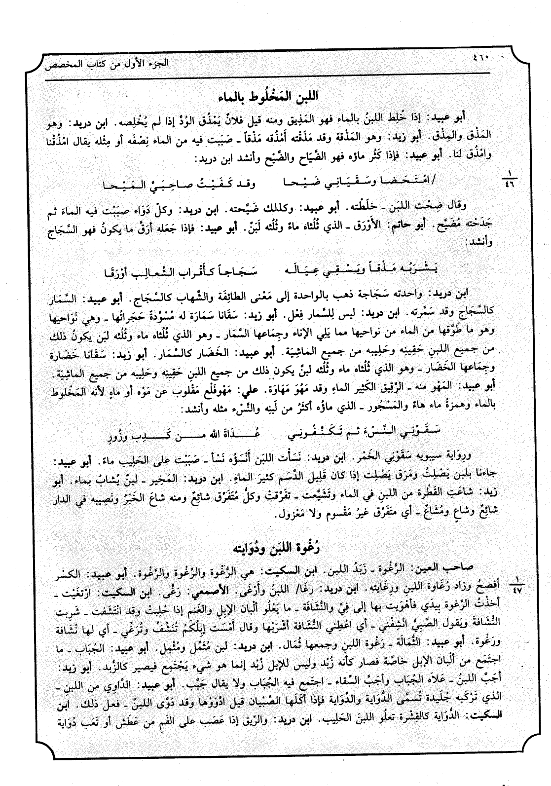 أَبُو عبيد، إِذا خُلِط اللبنُ بِالْمَاءِ فَهُوَ المَذيق وَمِنْه قيل فلانٌ يَمْذُق الوُدَّ إِذا لم يُخْلِصه، ابْن دُرَيْد، وَهُوَ المَذْق والمِذْق، أَبُو زيد، وَهُوَ المَذْقة وَقد مَذَقْته أَمْذُقه مَذْقاً - صَبَبت فِيهِ من المَاء نِصْفَه أَو مِثْله يُقَال أمْذُقْنا وأمْذُق لنا، أَبُو عبيد، فَإِذا كَثُر مَاؤُهُ فَهُوَ الضَّيَاح والضَّيْح وَأنْشد ابْن دُرَيْد امْتحَضا وسَقَيَاني ضَيْحاً وَقد كَفَيْتُ صاحِبيَّ الميَحْا وَقَالَ ضِحْت اللبَن - خَلطْته، أَبُو عبيد، وَكَذَلِكَ ضَيَّحته، ابْن دُرَيْد، وكلّ دَواءَ صبَبْت فِيهِ الماءَ ثمَّ جَدَحْته مُضَيَّح، أَبُو حَاتِم، الأَوْرَق - الَّذِي ثُلُثاه ماءٌ وثُلُثه لَبَنٌ، أَبُو عبيد، فَإِذا جَعَله أرَقَّ مَا يكونُ فَهُوَ السَّجَاج وَأنْشد يَشْرَبُه مَذْقاً ويَسْقي عِيَالَه سَجَاجاً كأقَرْاب الثَّعالِب أوْرقَا ابْن دُرَيْد، واحدته سَجَاجة ذهب بالواحدة إِلَى مَعْنى الطائِفَة والشَّهاب كالسَّجَاج، أَبُو عبيد، السَّمَار كالسَّجَاج وَقد سَمَّرته، ابْن دُرَيْد، لَيْسَ للِسَّمارِ فِعْل، أَبُو زيد، سَقَانا سَمَارَة لَهُ مًسْودَّةً حَجَراتُها - وَهِي نَوَاحيها وَهُوَ مَا طَوَّقها من المَاء من نَوَاحِيهَا مِمَّا يَلي الإِناء وجِمَاعها السَّمَار - وَهُوَ الَّذِي ثُلُثاه مَاء وثُلُثه لبَن يكونُ ذَلِك من جَمِيع اللبنِ حَقِينِة وحَلِيبه من جَمِيع الماشِيَة، أَبُو عبيد، الخَضَار كالسَّمَار، أَبُو زيد، سَقَانا خَضَارة وجِمَاعها الخَضَار - وَهُوَ الَّذِي ثُلُثاه مَاء وثُلُثه لبنٌ يكون ذَلِك من جَمِيع اللبنِ حَقِينِه وحَلِيبه من جَمِيع الماشِيَة، أَبُو عبيد، المَهْومنه - الرَّقِيق الكَثير الماءِ وَقد مَهُوَ مَهَاوَة، عَليّ، مَهْو فَلْع مَقْلوب عَن مَوَّه أوماه لِأَنَّهُ المَخْلوط بِالْمَاءِ وهمزةُ مَاء هاءٌ والمَسْجُور - الَّذِي ماؤُه أكَثُر من لَبَنِه والنَّسُ مثله وَأنْشد سَقَوَّني النَّسْءَ ثمَّ تَكَنَّفُوني عُداةَ الله من كَذِب وزُورِ ورِوَاية سِيبَوَيْهٍ سَقَوْني الخَمْر، ابْن دُرَيْد، نَسَأْت اللبَن أنْسَؤُه نَسْأ - صَبَبْت على الحَليب مَاء، أَبُو عبيد، جَاءَنَا بِلَبن بَصْلِتُ ومَرَق يَصْلِت إِذا كَانَ قَلِيل الدَّسَم كثير الماءِ، ابْن دُرَيْد، المَخِير - لبنٌ يشابُ بِمَاء، أَبُو زيد، شاعَتِ الفَطْرة من اللبنِ فِي المَاء وتَشَيَّعت - تَفَرَّقتْ وكلُّ مُتَفَرِّق شائِعٌ وَمِنْه شاعَ الخَبَرُ ونَصِيبه فِي الدَّار شائِعٌ وشاعٍ ومُشَاعٌ - أَي متَفَرِق غيرُ مَقْسوم وَلَا مَعْزول