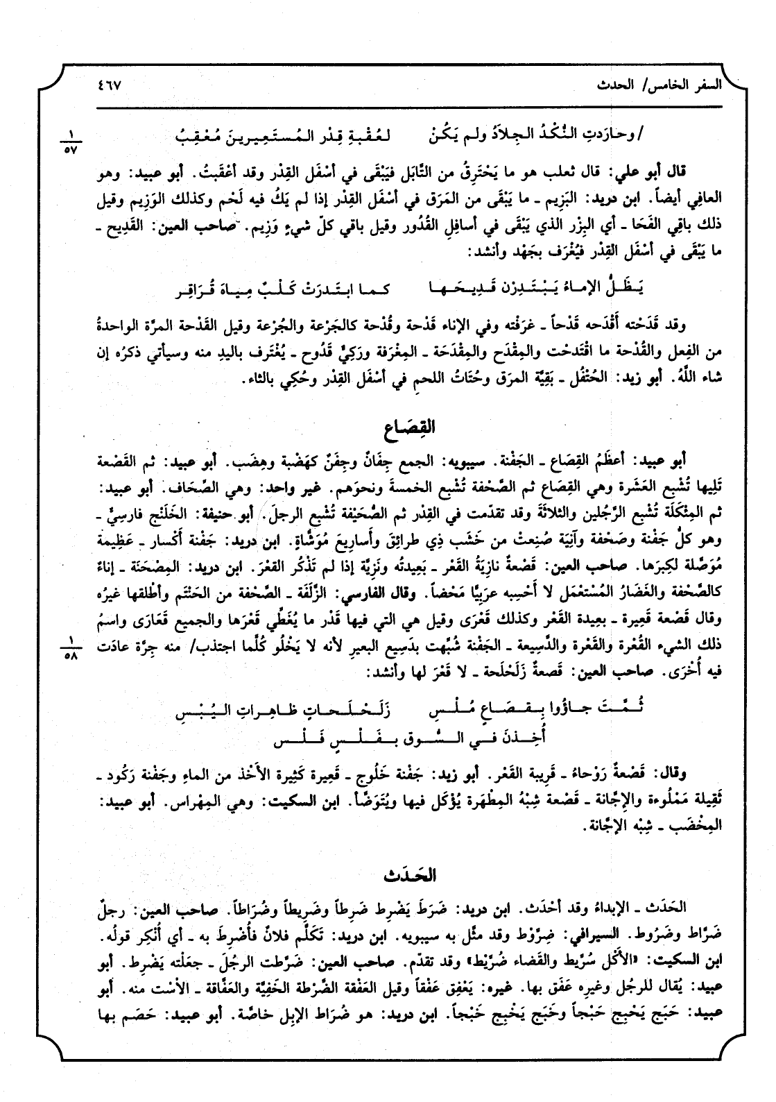 وحارَدتِ النُّكْدُ الجِلاَدُ وَلم يَكُنْ لعُقْبِة قِدْر المُسَتعيرين مُعْقِبُ قَالَ أَبُو عَليّ، قَالَ ثَعْلَب هُوَ مَا يَحْتَرِقُ من التْابَل فيبْقَى فِي أسْفَل القِدْر وَقد أعْقَبتُ، أَبُو عبيد، وَهُوَ الْعَافِي أَيْضا، ابْن دُرَيْد، البَزيم - مَا يَبْقَى من المَرَق فِي أسْفَل القِدْر إِذا لم يَكُ فِيهِ لَحْم وَكَذَلِكَ الوَزِيم وَقيل ذَلِك بَاقِي الفَحَا - أَي البِزْر الَّذِي يَبْقَى فِي أسافِلِ القُدُور وَقيل بَاقِي كلّ شيءٍ وَزيم، صَاحب الْعين، القَدِيح مَا يَبْقَى فِي أسْفَل القِدْر فيُغْرَف بجَهْد وَأنْشد يظَلُّ الإمِاءُ يَبْتَدِرْن قَدِيحَها كَمَا ابتَدرَتْ كَلْبُ مِياهَ قُرَاقِر وَقد قَدَحْته أَقْدَحه قَدْحاً - غَرفْته وَفِي الإناءِ قَدْحه كالجَرْعة والجُرْعة وَقيل القدْحة المرَّة الواحدةُ من الفِعل والقُدْحة مَا اقْتَدحْت والمِقْدَح والمِقْدَحَة - المِغْرَفة ورِكيُّ قَدُوح - يُغْتَرف باليدِ مِنْهُ وَسَيَأْتِي ذكرُه إِن شَاءَ اللهُ، أَبُو زيد، الحُتْفُل - بَقيَّة المرَق وحُتَاتُ اللحمِ فِي أسْفَل القِدْر وحُكي بالثاء