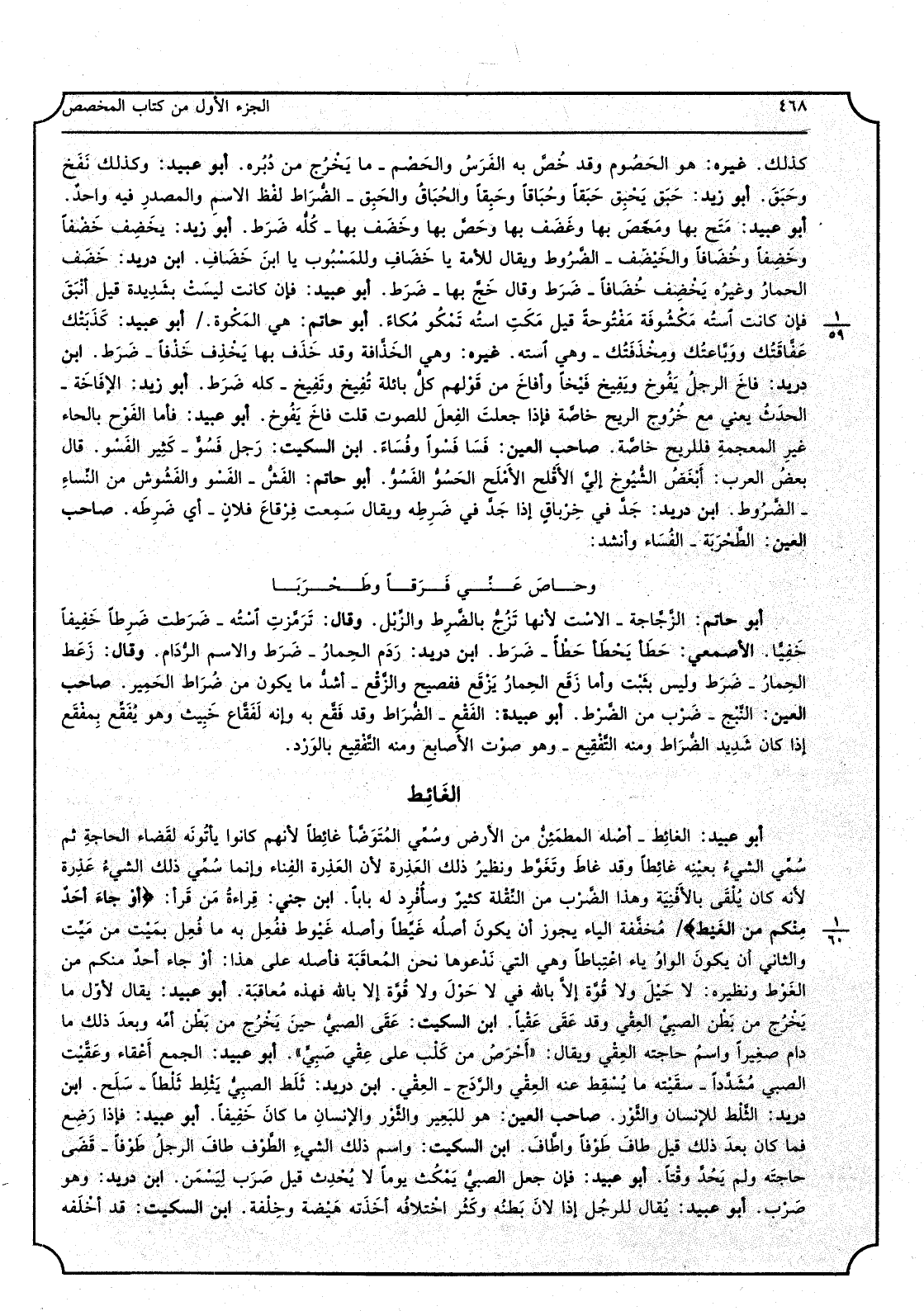 أَبُو عبيد، الغائِط - أَصله المطمَئِنُّ من الأَرْض وسُمِّي المُتوَضَّأ غائِطاً لأَنهم كَانُوا يأتُونَه لقَضاء الحاجةِ ثمَّ سُمَّي الشيءُ بعيْنهِ غائِطاً وَقد غاطَ وتَغَوَّط ونظيرُ ذَلِك العَذِرة لِأَن العَذِرة الفِناء وَإِنَّمَا سُمِّي ذَلِك الشيءُ عَذِرة لِأَنَّهُ كَانَ يُلْقَى بالأَفْنَية وَهَذَا الضَّرْب من النَقْلة كثيرٌ وسأُفْرِد لَهُ بَابا، ابْن جنى، قِراءةُ من قَرأ أَو جاءَ أحَدٌ مِنْكم من الغَيْط مُخَفَّفة الْيَاء يجوز أَن يكونَ أصلُه غَيِّطاً وأصلُه غَيْوط ففُعِل بِهِ مَا فُعِل بَميْت من مَيِّت وَالثَّانِي أَن يكونَ الواوُ اعْتِباطاً وَهِي الَّتِي نَدْعوها نَحن المُعاقَبَة فأصله على هَذَا أوْ جَاءَ أحدٌ مِنْكُم من الغَوْط وَنَظِيره لَا خَيْلَ وَلَا قُوَّة إلاَّ بِاللَّه فِي لَا حَوْلَ وَلَا قُوَّة إِلَّا بِاللَّه فَهَذِهِ مُعاقبَة، أَبُو عبيد، يُقَال لأوّل مَا يَخْرُج من بَطْن الصبيَّ العِقْي وَقد عَقَى عَقْياً، ابْن السّكيت، عَقَى الصبيُّ حينَ يَخْرُج من بَطْنِ أمِّه وبعدَ ذَلِك مَا دَامَ صَغِيرا واسمُ حَاجته العِقْى وَيُقَال (أَحْرصُ من كَلْب على عِقْى صَبِيٍّ) ، أَبُو عبيد، الْجمع أَعْقاء وعَقَّيْت الصَّبِي مُشَدَّداً - سقَيْته مَا يُسْقِط عَنهُ العِقْى والرَّدَج - العِقْي، ابْن دُرَيْد، ثَلَط الصبِيُّ يَثْلِط ثَلْطاً - سَلَح، ابْن دُرَيْد، الثَّلْط للْإنْسَان والثَّوْر، صَاحب الْعين، هُوَ للبَعير والثَّوْر والإنسانِ مَا كَانَ خَفِيفاً، أَبُو عبيد، فَإِذا رَضِع فَمَا كَانَ بعدَ ذَلِك قيل طافَ طَوْفاً وأطَّافْ، ابْن السّكيت، وَاسم ذَلِك الشيءِ الطَّوْف طافَ الرجلُ طَوْفاً - قَضَى حاجِتَه وَلم يَحُدَّ وقْتاً، أَبُو عبيد، فَإِن جعل الصبيُّ يَمْكُث يَوْمًا لَا يُحْدِث قيل صَرَب ليَسْمَن، ابْن دُرَيْد، وَهُوَ صَرْب، أَبُو عبيد، يُقال للرجُل إِذا لانَ بَطنُه وكَثُر إخْتلافُه أخَذَته هَيْضة وخِلْفة، ابْن السّكيت، قد أخْلَفه