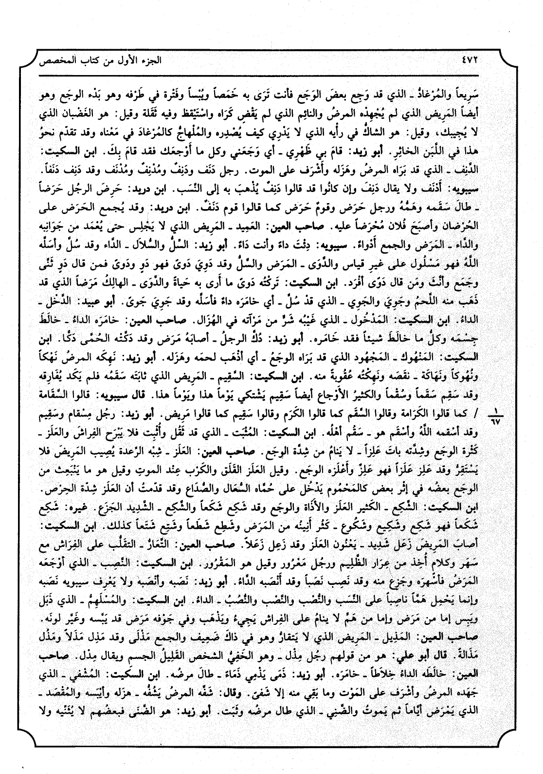 سَريعاً والمُرْغادُّ - الَّذِي قد وَجِع بعضَ الوَجَع فَأَنت تَرَى بِهِ خَمصَاً ويُبْساً وفَتْرة فِي طَرْفه وَهُوَ بَدْء الوجَع وَهُوَ أَيْضا المَريض الَّذِي لم يُجْهِدْه المرضُ والنائِم الَّذِي لم يَقْضِ كَرَاه واسْتَيْقظ وَفِيه ثَقَلة وَقيل هُوَ الغَضْبان الَّذِي لَا يُجِيبك وَقيل هُوَ الشاكُّ فِي رأْيه الَّذِي لَا يَدْري كَيفَ يُصْدِره والمُلْهاجُّ كالمُرْغادّ فِي مَعْناه وَقد تقدّم نحوُ هَذَا فِي اللَّبَن الخاثِرِ، أَبُو زيد، قامَ بِي ظَهْري - أَي وَجَعَني وكل مَا أَوْجعَك فقد قامَ بِكَ، ابْن السّكيت، الدَّنِف - الَّذِي قد بَرَاه المرضُ وهَزَله وأَشْرَف على الْمَوْت رجل دَنَف ودَنِفٌ ومُدْنِفٌ ومُدْنِف وَقد دَنِف دَنَفاً، سِيبَوَيْهٍ، أَدْنَف وَلَا يُقَال دَنِفَ وَإِن كانُوا قد قَالُوا دَنِفٌ يُذْهبَ بِهِ إِلَى النَّسَب، ابْن دُرَيْد، حَرِضَ الرجُل حَرَضاً - طالَ سَقَمه وهَمُّهُ وَرجل حَرَض وقومٌ حَرَض كَمَا قَالُوا قوم دَنَفٌ، ابْن دُرَيْد، وَقد يُجمع الحَرَض على الحُرْضان وأصبحَ فُلان مُحْرَضاً عَلَيْهِ، صَاحب الْعين، العَميد - المَريض الَّذِي لَا يَجْلِس حَتَّى يُعْمَد من جَوَانِبه والدَّاء - المَرَض وَالْجمع أَدْواءٌ، سِيبَوَيْهٍ، دِئْتَ دَاء وَأَنت دَاءٌ، أَبُو زيد، السِّلُّ والسُّلال - الدَّاء وَقد سُلَّ وأسَلَّه اللهُ فَهُوَ مَسْلُول على غير قِيَاس والدَّوَى - المَرَض والسِّلُّ وَقد دَوَى دَوىً فَهُوَ دَوٍ ودَوىً فَمن قَالَ دَوٍ ثَنَّى وجَمَع وأنَّثَ ومَن قَالَ دَوىً أفْرَد، ابْن السّكيت، تَركْتُه دَوَى مَا أَرَى بِهِ حَياةً والدَّوَى - الهالكُ مَرَضاً الَّذِي قد ذهب مِنْهُ اللَّحمُ وجَويَ والجّوي - الَّذِي قدْ سُلَّ - أَي خامَرَه داءٌ فأسَلَّه وَقد جَويَ جويً، أَبُو عبيد، الدَّخْل - الداءُ، ابْن السّكيت، المَدْخُول - الَّذِي غَبْبُه شّرُّ من مَرْآته فِي الهُزَال، صَاحب الْعين، خامَرَه الداءُ خالَطَ جِسْمَه وكلُّ مَا خالَطَ شَيْئا فقد خَامَره، أَبُو زيد، دُكَّ الرجلُ - أصابَهُ مَرَض وَقد دَكَّتْه الحُمَّى دَكَّاً، ابْن السّكيت، المنَهُوك - المَجْهُود الَّذِي قد بَرَاه الوجَعُ - أَي أذْهب لحَمه وهَزَله، أَبُو زيد، نَهِكَه المرضُ نَهْكاً ونُهُوكاً ونَهَاكَة - نقَصَه ونَهِكْتُه عُقُوبةً مِنْهُ، ابْن السّكيت، السَّقيم - المَريض الَّذِي ثابَتَه سَقَمهُ فَلم يَكَد يُفَارِقه وَقد سَقِم سَقَماً وسُقْماً والكثيرُ الأَوْجاع أَيْضا سَقِيم يَشْتكي يَوْماً هَذَا ويَوْماً هَذَا، قَالَ سِيبَوَيْهٍ، قَالُوا السَّقامة كَمَا قَالُوا الكَرَامة وَقَالُوا السَّقَم كَمَا قَالُوا الكَرَم وَقَالُوا سَقِيم كَمَا قَالُوا مَرِيض، أَبُو زيد، رجُل مِسْقام وسَقيم وَقد أسْقمه اللهُ وأسْقِم هُوَ - سَقُم أهْلُه، ابْن السّكيت، المُثْبَت - الَّذِي قد ثَقُل وأثْبِت فَلَا يَبْرَح الفِراشَ والعَلز - كَثْرة الوجَع وشِدَّته باتَ عَلِزاً - لَا يَنامُ من شِدَّة الوجَع، صَاحب الْعين، العَلَز - شِبْه الرِّعدة يُصيب المَريضَ فَلَا يَسْتَقِرُّ وَقد عَلِز عَلَزاً فَهُوَ عَلِزٌ وأَعْلَزه الوجَع وَقيل العَلَز القَلقَ والكَرْب عِنْد الموتِ وَقيل هُوَ مَا يَنْبِعث من الوجَع بعضُه فِي إثْر بعض كالمَحْمُوم يَدْخُل على حُمَّاء السُّعال والصُّدَاع وَقد قدّمتُ أَن العَلَز شِدّة الحِرْص، ابْن السّكيت، الشَّكِع - الكَثير العَلَز والأَذاة والوجَع وَقد شَكِع شَكَعاً والشَّكعِ - الشَّديد الجَزَع، غَيره، شَكِع شَكَعاً فَهُوَ شَكِع وشَكِيع وشكُوع - كَثُر أَنِينُه من المَرَض وشَطِع شَطَعاً وشَتِع شَتَعاً كَذَلِك، ابْن السّكيت، أصَاب المَريضَ زَعَل شَديد - يَعْنُون العَلَز وَقد زَعِل زَعَلاً، صَاحب الْعين، التَّعَارُّ - التقَلُّب على الفِراش مَعَ سَهَر وكلامٍ أُخِذ من عِرّار الظَّليم ورجُل مَعْرُور وَقيل هُوَ المَقْرُور، ابْن السّكيت، النَّصِب - الَ