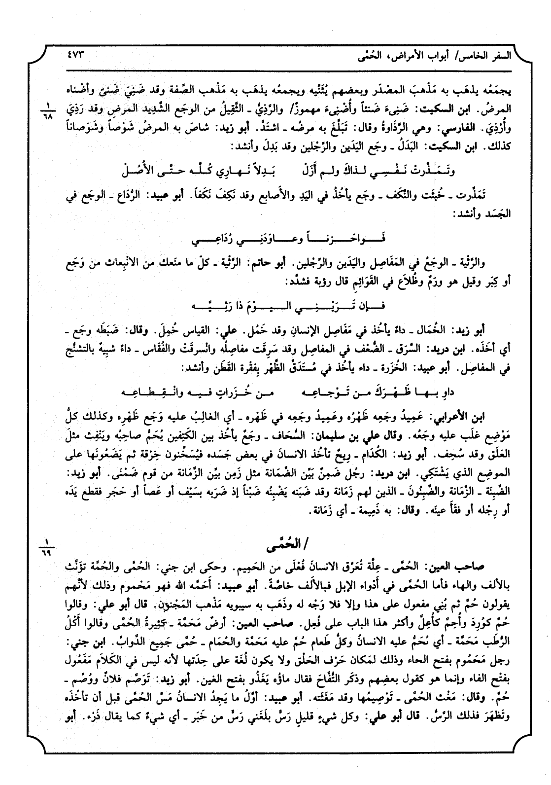 يجمَعُه يذهَب بِهِ مَذْهب المصْدَر وَبَعْضهمْ يُثَنِّيه ويجمعُه يذهَب بِهِ مَذْهب الصِّفة وَقد ضَني ضَنيً وأضْناه المرضُ، ابْن السّكيت، ضَنيءَ ضَنَأ وأُضْنيءَ مهموزٌ والرَّذيُّ - الثَّقيلُ من الوجَع الشَّديد والمرِض وَقد رَذِيَ وأُرْذيَ، الْفَارِسِي، وَهِي الرَّذَاوةُ وَقَالَ تَبَلَّغَ بِهِ مرضُه - إشتَدَّ، أَبُو زيد، شاصَ بِهِ المرضُ شَوْصاً وشَوَصاناً كَذَلِك، ابْن السّكيت، البَدَلُ - وجَع اليَدَين والرِّجْلين وَقد بَدِلَ وأنشدَّكعِ - الشَّديد الجَزَع، غَيره، شَكِع شَكَعاً فَهُوَ شَكِع وشَكِيع وشكُوع - كَثُر أَنِينُه من المَرَض وشَطِع شَطَعاً وشَتِع شَتَعاً كَذَلِك، ابْن السّكيت، أصَاب المَريضَ زَعَل شَديد - يَعْنُون العَلَز وَقد زَعِل زَعَلاً، صَاحب الْعين، التَّعَارُّ - التقَلُّب على الفِراش مَعَ سَهَر وكلامٍ أُخِذ من عِرّار الظَّليم ورجُل مَعْرُور وَقيل هُوَ المَقْرُور، ابْن السّكيت، النَّصِب - الَّذِي أوْجَعَه المَرَضُ فأسْهرَه وجَزِع مِنْهُ وَقد نَصِب نَصَباً وَقد أنَصْبَه الدَّاء، أَبُو زيد، نَصَبه وأنْصَبه وَلَا يَعْرِف سِيبَوَيْهٍ نَصَبه وَإِنَّمَا يَحْمِل هَمّاً ناصباً على النَّسَب والنُّصْب والنَّصْب والنُّصُبُ - الداءُ، ابْن السّكيت، والمُسْلَهِمُّ - الَّذِي ذَبَل ويَبِس إِمَّا من مَرَض وَإِمَّا من هَمٍ لَا ينامُ على الفِراش يَجيء ويَذْهب وَفِي جَوْفه مَرَض قد يَبَّسه وغَيَّر لونَه، صَاحب الْعين، المَذيل - المَريض الَّذِي لَا يتقارُّ وَهُوَ فِي ذاكَ ضَعِيف وَالْجمع مَذْلى وَقد مَذِل مَذَلاً ومَذُل مَذَالةً، قَالَ أَبُو عَليّ، هُوَ من قَوْلهم رجُل مِذْل - وَهُوَ الخَفيُّ الشَّخْص القَليلُ الجسمِ وَيُقَال مِذْل، صَاحب الْعين، خالَطَه الداءُ خِلاطاً - خامَرَه، أَبُو زيد، ذَمَى يَذْمي ذَمَاء - طالَ مرضُه، ابْن السّكيت، المُشْفي - الَّذِي جَهَده المرضُ وأشْرَف على المَوْت وَمَا بَقي مِنْهُ إِلَّا شَفَى، وَقَالَ، شَفَّه المرضُ يَشُفُّه - هزَله وأيْبَسه والمُقصَد - الَّذِي يَمْرَض أيَّاماً ثمَّ يَموتُ والضَّني - الَّذِي طَال مرضُه وثَبَت، أَبُو زيد، هُوَ الضَّنَي فبعضُهم لَا يُثَنِّيه وَلَا يجمَعُه يذهَب بِهِ مَذْهب المصْدَر وَبَعْضهمْ يُثَنِّيه ويجمعُه يذهَب بِهِ مَذْهب الصِّفة وَقد ضَني ضَنيً وأضْناه المرضُ، ابْن السّكيت، ضَنيءَ ضَنَأ وأُضْنيءَ مهموزٌ والرَّذيُّ - الثَّقيلُ من الوجَع الشَّديد والمرِض وَقد رَذِيَ وأُرْذيَ، الْفَارِسِي، وَهِي الرَّذَاوةُ وَقَالَ تَبَلَّغَ بِهِ مرضُه - إشتَدَّ، أَبُو زيد، شاصَ بِهِ المرضُ شَوْصاً وشَوَصاناً كَذَلِك، ابْن السّكيت، البَدَلُ - وجَع اليَدَين والرِّجْلين وَقد بَدِلَ وَأنْشد وتَمذَّرتْ نَفْسي لذاك وَلم أَزَلْ بَدلاً نَهاري كُلَّه حتَّى الأُصُلْ تَمَذَّرت - خُبثَت والنّكف - وجَع يأخُذُ فِي اليَدِ والأصَابع وَقد نَكِفَ نَكَفاً، أَبُو عبيد، الرُّدَاع - الوجَع فِي الجَسَد وَأنْشد فَوا حَزناً وعاوَدَني رُدَاعي والرَّثْية - الوجَعُ فِي المفَاصِل واليَدَين والرَجْلين، أَبُو حَاتِم، الرَّثْية - كلّ مَا منَعك من الإنْبِعاث من وَجَع أوِ كِبَر وَقيل هُوَ ورَمٌ وظُلاع فِي القَوائِمِ قَالَ رؤبة فشدَّد فَإِن تَرَيْني اليوْمَ ذارَثِيَّه أَبُو زيد، الخُمَال - داءٌ يأخُذ فِي مفَاصِل الْإِنْسَان وَقد خَمُل، عَليّ، الْقيَاس خُمِلَ، قَالَ، ضَبَطَه وجَع - أَي أخَذَه، ابْن دُرَيْد، السَّرَق - الضُّعْف فِي المفاصِل وَقد سَرِقَت مفاصِلُه وإنْسرقَتْ والفُقَاس - داءٌ شبِيهٌ بالتشنُّج فِي المفاصِل، أَبُو عبيد، الخُزَرة - دَاء يأخُذ فِي مُسَتَدقِ الظَّهْر بِفقْرة القَطَن وَأنْشد داوِ بهَا ظَهْركَ من تَوْجاعِه من خُزَراتٍ فِيهِ وانْقِطاعِه ابْن الْأَعرَابِي، عَميدُ وجَعِه ظَهْرُه وعَميدُ وجَعِه فِي ظَهْره - أَي الغالِبُ عَلَيْهِ وَجَع ظَهْره وَكَذَلِكَ كلُّ مَوْضِع غلَب ع