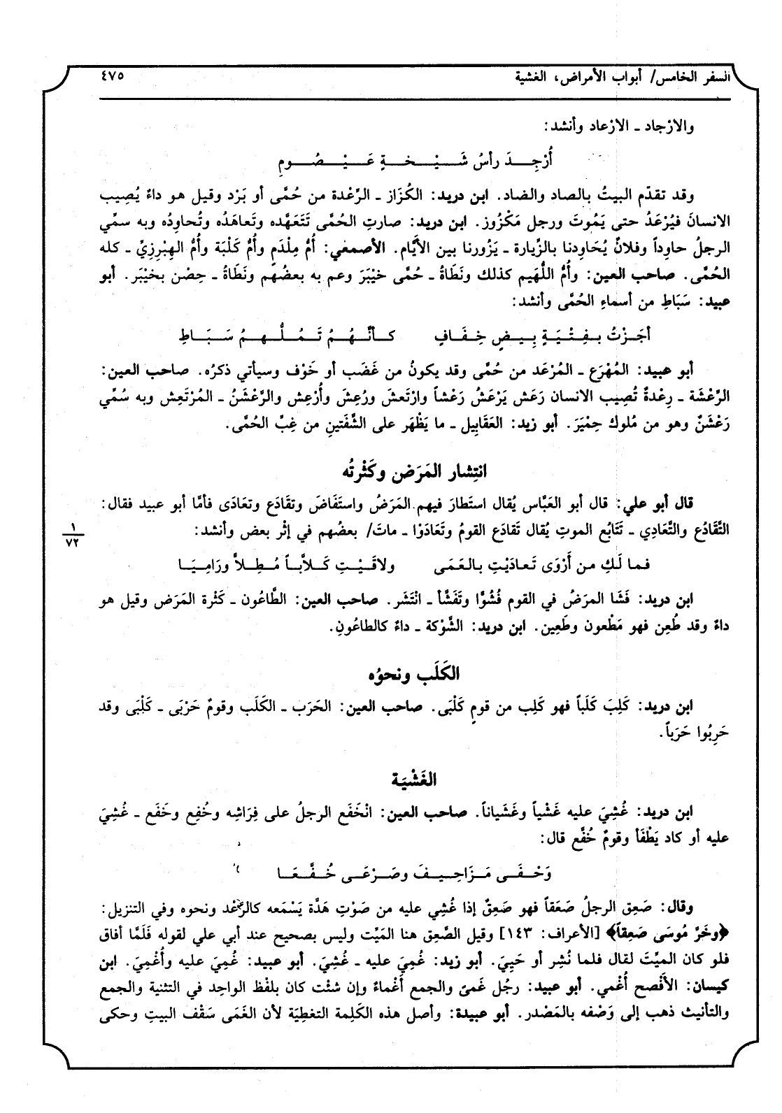 قَالَ أَبُو عَليّ، قَالَ أَبُو العَبَّاس يُقال إستَطارَ فيهم المَرَضُ وإستَفَاضَ وتقَادَع وتعَادَى فأمَّا أَبُو عبيد فَقَالَ التَّقَادُع والتَّعادي - تَتَابُع الموتِ يُقال تَقادَع القومُ وتَعَادْوا - ماتَ بعضُهم فِي إثْر بعض وَأنْشد فمالَكِ من أَرْوى تَعاديْتِ بالعَمَى ولاقَيْتِ كَلاَّباً مُطِلاًّ ورَامِياً ابْن دُرَيْد، فَشَا المرَضُ فِي الْقَوْم فُشُوّاً وتَفَشَّأ - انْتَشَر، صَاحب الْعين، الطَّاعُون - كَثْرة المَرَض وَقيل هُوَ داءٌ وَقد طُعِن فَهُوَ مَطْعون وطَعِين، ابْن دُرَيْد، الشَّوْكة - داءٌ كالطاعُونِ