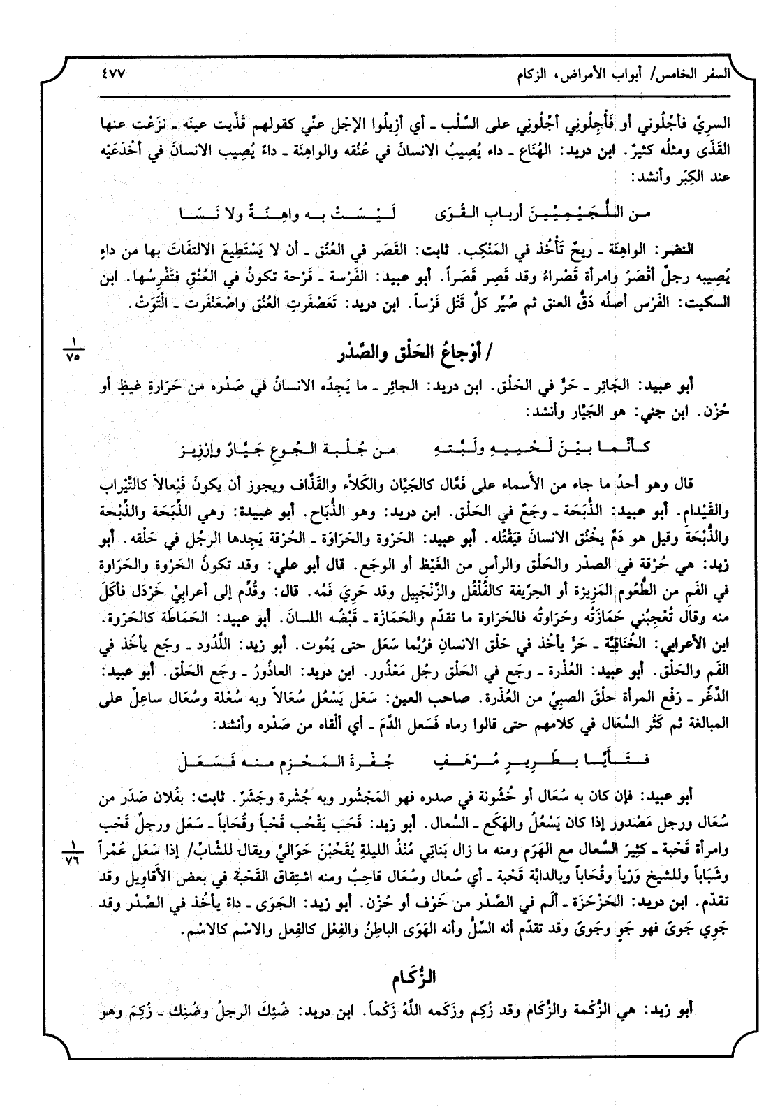 أَبُو عبيد، الجَائِر - حَرُّ فِي الحَلْق، ابْن دُرَيْد، الجائِر - مَا يَجِدهُ الإنسانُ فِي صَدْره من حَرَارِة غيظٍ أَو حُزْن، ابْن جنى، هُوَ الجَيَّار وَأنْشد كأنمَّا بيْنَ لحَيْيه ولَبَّتهِ من جُلْبة الجُوعِ جَيَّارٌ وإرْزِيز قَالَ وَهُوَ أحدُ مَا جَاءَ من الأسَماء على فَعَّال كالجَبَّان والكَلأَّ والقَذَّاف وَيجوز أَن يكونَ فَيْعالاً كالتَّيْراب والقَيْدامِ، أَبُو عبيد، الذُّبَحَة - وجَعٌ فِي الحَلْق، ابْن دُرَيْد، وَهُوَ الذُّبَاح، أَبُو عُبَيْدَة، وَهِي الذِّبَحَة والذِّبْحة والذُّبْحة وَقيل هُوَ دَمٌ يخْنُق الْإِنْسَان فيَقُتُله، أَبُو عبيد، الحَرْوة والحَرَاوَة - الحُرْقة يَجِدها الرجُل فِي حَلْقه، أَبُو زيد، هِيَ حُرْقة فِي الصدْر والحَلْق والرأسِ من الغَيْظ أَو الوجَع، قَالَ أَبُو عَليّ، وَقد تكونُ الحَرْوة والحَرَاوة فِي الفَمِ من الطُّعُوم المَزيزة أَو الحِرِّيفة كالفُلْفُل والزَّنْجَبيل وَقد حَرِى فَمُه، قَالَ، وقُدِّم إِلَى أَعْرَابِي خَرْدَل فأكَلَ مِنْهُ وَقَالَ تُعْجِبني حَمَازَتُه وحَرَاوتُه فالحَرَاوة مَا تقدّم والحَمَازَة - قَبْضُه اللسانَ، أَبُو عبيد، الحَمَاطَة كالحَرْوة، ابْن الْأَعرَابِي، الحُنَاقِيَّة - حَرُّ يأخُذ فِي حَلْق الْإِنْسَان فرُبمَّا سَعَل حَتَّى يَمُوت، أَبُو زيد، اللَّدُود - وجَع يأخُذ فِي الفَمِ والحَلْق، أَبُو عبيد، العُذْرة - وجَع فِي الحَلْق رجُل مَعْذُور، ابْن دُرَيْد، العاذُورُ وجَع الحَلْق، أَبُو عبيد، الدَّغْر - رَفْع الْمَرْأَة حلْقَ الصبيِّ من العُذْرة، صَاحب الْعين، سَعَل يَسْعُل سُعَالاً وَبِه سُعْلة وسُعَال ساعِلٌ على الْمُبَالغَة ثمَّ كَثُر السُّعَال فِي كَلَامهم حَتَّى قَالُوا رَمَاه فَسَعل الدَّم - أَي أَلْقَاهُ من صَدْره وَأنْشد فتَأَيَّا بطَريرٍ مُرْهَفٍ جُفْرةَ المَحْزِم مِنْهُ فَسَعَلْ أَبُو عبيد، فَإِن كَانَ بِهِ سُعَال أَو خُشُونة فِي صَدره المَجْشُور وَبِه جُشْرة وجَشَرٌ، ثَابت، بفُلان صَدَر من سُعَال وَرجل مَصْدور إِذا كَانَ يَسْعُلُ والهَكَع - السُّعال، أَبُو زيد، قَحَب يَقْحُب قَحْباً وقُحاباً - سَعَل ورجلٌ قَحْب وَامْرَأَة قَحْبة - كثيرَ السُّعال مَعَ الهَرَم وَمِنْه مَا زَالَ بنَاتي مُنْذُ الليلةِ يُقَحَبْن حَوَالي وَيُقَال للشَّابِّ إِذا سَعَل عُمْراً وشَبَاباً وللشيخ وَرْباً وقُحَاباً وبالدابَّة قَحْبة - أَي سُعال وسُعَال قاحِبٌ وَمِنْه إشتِقاق القَحْبة فِي بعض الأَقاويل وَقد تقدّم، ابْن دُرَيْد، الحَزْحَزَة - ألم فِي الصَّدْر من خَوْف أَو حُزْن، أَبُو زيد، الجَوَي - داءٌ يأخُذ فِي الصَّدْر وَقد جَوي جَوىً فَهُوَ جَوٍ وجَوىً وَقد تقدّم أَنه السِّلُّ وَأَنه الهَوَى الباطِنُ والفِعْل كالفِعل والإسْم كالإسْم