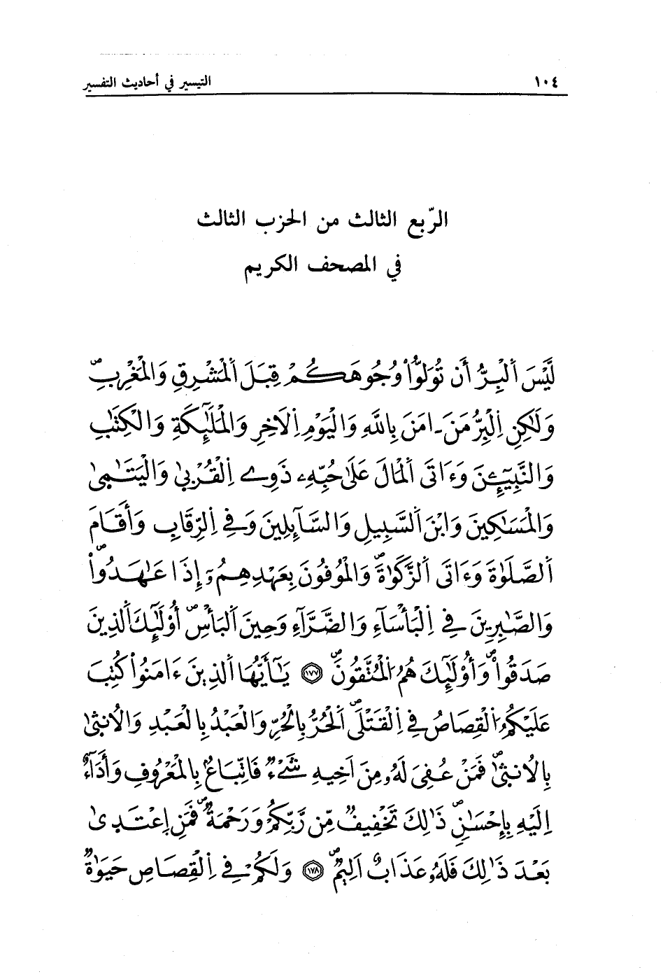 لَيْسَ الْبِرَّ أَنْ تُوَلُّوا وُجُوهَكُمْ قِبَلَ الْمَشْرِقِ وَالْمَغْرِبِ وَلَكِنَّ الْبِرَّ مَنْ آمَنَ بِاللَّهِ وَالْيَوْمِ الْآخِرِ وَالْمَلَائِكَةِ وَالْكِتَابِ وَالنَّبِيِّينَ وَآتَى الْمَالَ عَلَى حُبِّهِ ذَوِي الْقُرْبَى وَالْيَتَامَى وَالْمَسَاكِينَ وَابْنَ السَّبِيلِ وَالسَّائِلِينَ وَفِي الرِّقَابِ وَأَقَامَ الصَّلَاةَ وَآتَى الزَّكَاةَ وَالْمُوفُونَ بِعَهْدِهِمْ إِذَا عَاهَدُوا وَالصَّابِرِينَ فِي الْبَأْسَاءِ وَالضَّرَّاءِ وَحِينَ الْبَأْسِ أُولَئِكَ الَّذِينَ صَدَقُوا وَأُولَئِكَ هُمُ الْمُتَّقُونَ (177) يَا أَيُّهَا الَّذِينَ آمَنُوا كُتِبَ عَلَيْكُمُ الْقِصَاصُ فِي الْقَتْلَى الْحُرُّ بِالْحُرِّ وَالْعَبْدُ بِالْعَبْدِ وَالْأُنْثَى بِالْأُنْثَى فَمَنْ عُفِيَ لَهُ مِنْ أَخِيهِ شَيْءٌ فَاتِّبَاعٌ بِالْمَعْرُوفِ وَأَدَاءٌ إِلَيْهِ بِإِحْسَانٍ ذَلِكَ تَخْفِيفٌ مِنْ رَبِّكُمْ وَرَحْمَةٌ فَمَنِ اعْتَدَى بَعْدَ ذَلِكَ فَلَهُ عَذَابٌ أَلِيمٌ (178) وَلَكُمْ فِي الْقِصَاصِ حَيَاةٌ