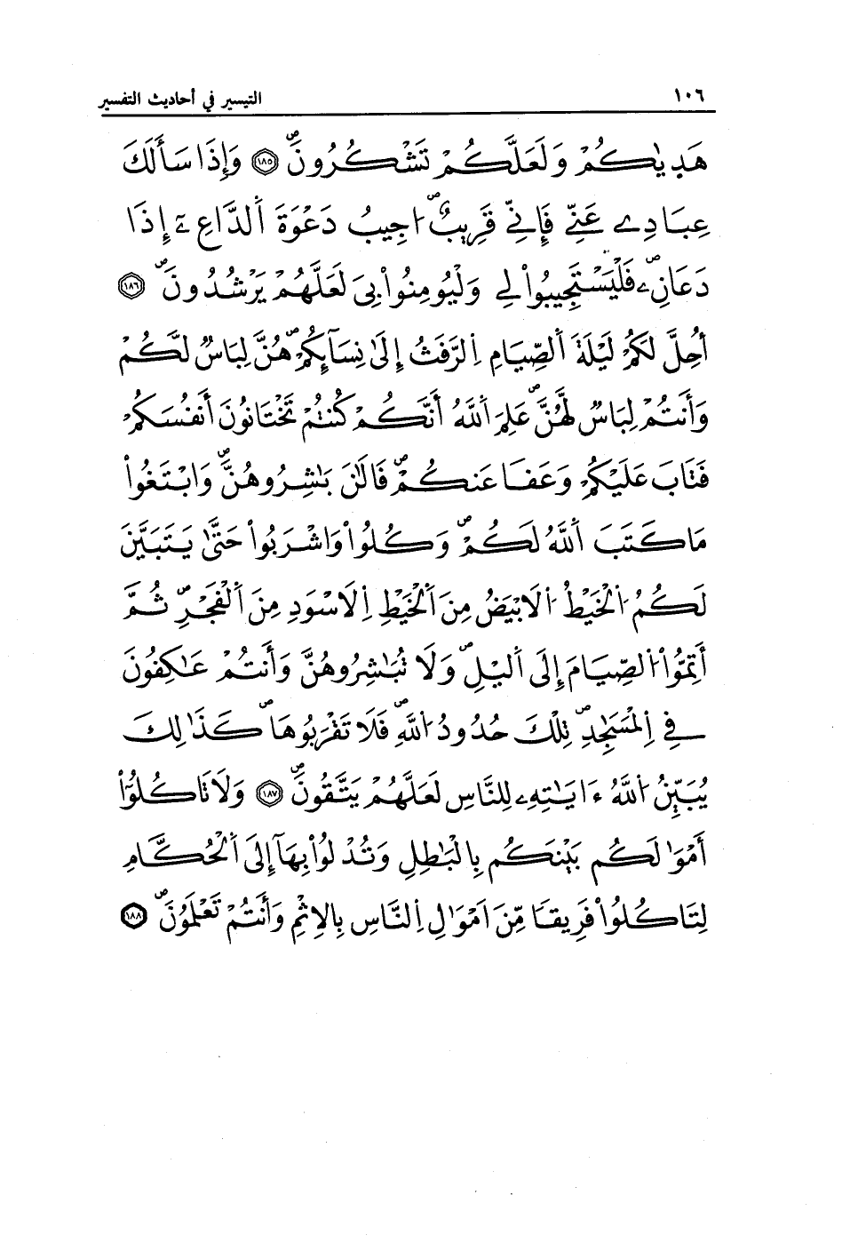 هَدَاكُمْ وَلَعَلَّكُمْ تَشْكُرُونَ (185) وَإِذَا سَأَلَكَ عِبَادِي عَنِّي فَإِنِّي قَرِيبٌ أُجِيبُ دَعْوَةَ الدَّاعِ إِذَا دَعَانِ فَلْيَسْتَجِيبُوا لِي وَلْيُؤْمِنُوا بِي لَعَلَّهُمْ يَرْشُدُونَ (186) أُحِلَّ لَكُمْ لَيْلَةَ الصِّيَامِ الرَّفَثُ إِلَى نِسَائِكُمْ هُنَّ لِبَاسٌ لَكُمْ وَأَنْتُمْ لِبَاسٌ لَهُنَّ عَلِمَ اللَّهُ أَنَّكُمْ كُنْتُمْ تَخْتَانُونَ أَنْفُسَكُمْ فَتَابَ عَلَيْكُمْ وَعَفَا عَنْكُمْ فَالْآنَ بَاشِرُوهُنَّ وَابْتَغُوا مَا كَتَبَ اللَّهُ لَكُمْ وَكُلُوا وَاشْرَبُوا حَتَّى يَتَبَيَّنَ لَكُمُ الْخَيْطُ الْأَبْيَضُ مِنَ الْخَيْطِ الْأَسْوَدِ مِنَ الْفَجْرِ ثُمَّ أَتِمُّوا الصِّيَامَ إِلَى اللَّيْلِ وَلَا تُبَاشِرُوهُنَّ وَأَنْتُمْ عَاكِفُونَ فِي الْمَسَاجِدِ تِلْكَ حُدُودُ اللَّهِ فَلَا تَقْرَبُوهَا كَذَلِكَ يُبَيِّنُ اللَّهُ آيَاتِهِ لِلنَّاسِ لَعَلَّهُمْ يَتَّقُونَ (187) وَلَا تَأْكُلُوا أَمْوَالَكُمْ بَيْنَكُمْ بِالْبَاطِلِ وَتُدْلُوا بِهَا إِلَى الْحُكَّامِ لِتَأْكُلُوا فَرِيقًا مِنْ أَمْوَالِ النَّاسِ بِالْإِثْمِ وَأَنْتُمْ تَعْلَمُونَ (188)