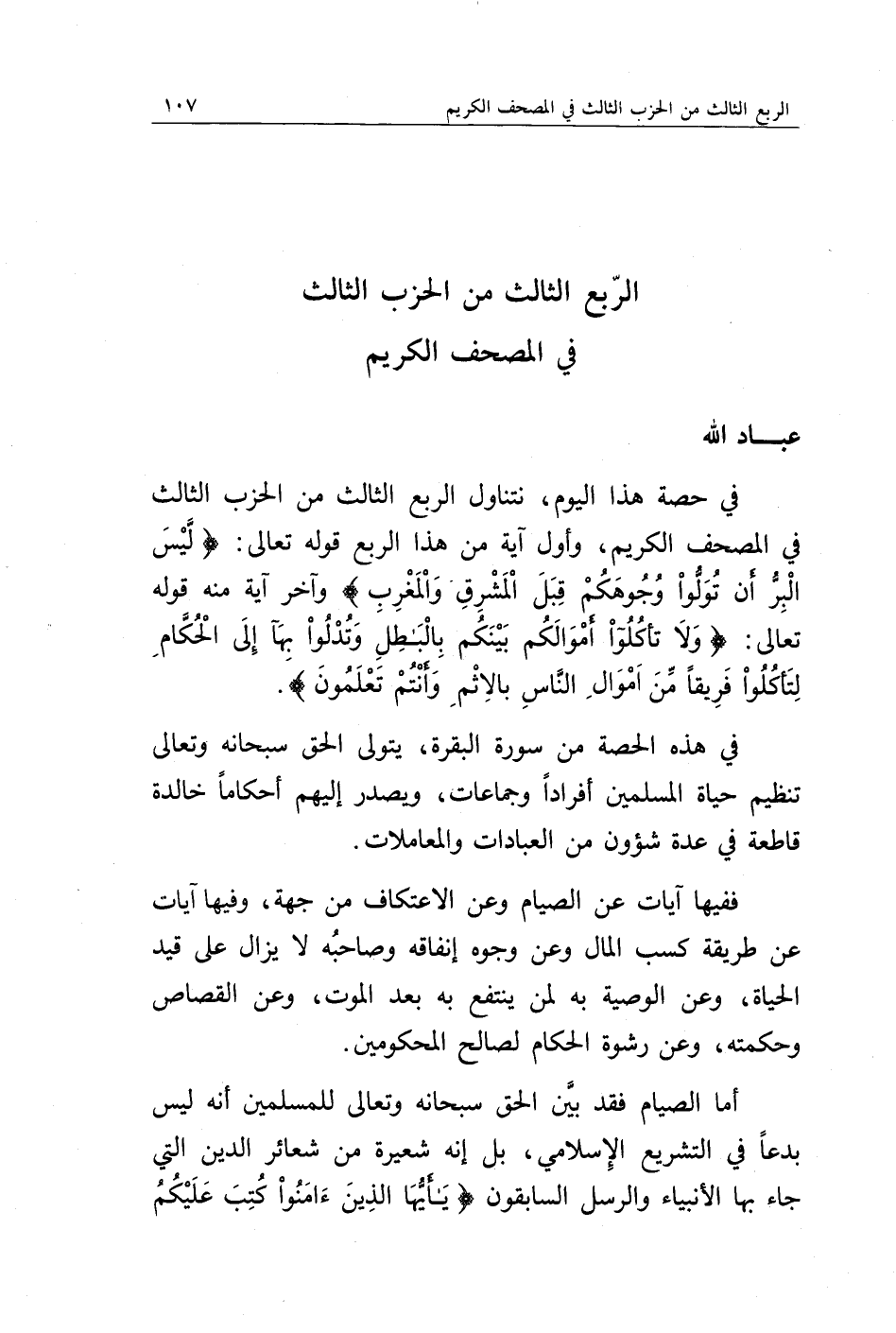 في حصة هذا اليوم، نتأول الربع الثالث من الحزب الثالث في المصحف الكريم، وأول آية من هذا الربع قوله تعالى: {لَيْسَ الْبِرَّ أَنْ تُوَلُّوا وُجُوهَكُمْ قِبَلَ الْمَشْرِقِ وَالْمَغْرِبِ} وآخر آية منه قوله تعالى: {وَلَا تَأْكُلُوا أَمْوَالَكُمْ بَيْنَكُمْ بِالْبَاطِلِ وَتُدْلُوا بِهَا إِلَى الْحُكَّامِ لِتَأْكُلُوا فَرِيقًا مِنْ أَمْوَالِ النَّاسِ بِالْإِثْمِ وَأَنْتُمْ تَعْلَمُونَ}.