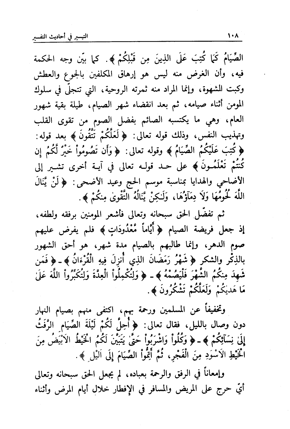 الصِّيَامُ كَمَا كُتِبَ عَلَى الَّذِينَ مِنْ قَبْلِكُمْ}. كما بين وجه الحكمة فيه، وأن الغرض منه ليس هو إرهاق المكلفين بالجوع والعطش وكبت الشهوة، وإنما المراد منه ثمرته الروحية، التي تتجلى في سلوك المؤمن أثناء صيامه، ثم بعد انقضاء شهر الصيام، طيلة بقية شهور العام، وهي ما يكتسبه الصائم بفضل الصوم من تقوى القلب وتهذيب النفس، وذلك قوله تعالى: {لَعَلَّكُمْ تَتَّقُونَ}. بعد قوله: {كُتِبَ عَلَيْكُمُ الصِّيَامُ}. وقوله تعالى: {وَأَنْ تَصُومُوا خَيْرٌ لَكُمْ إِنْ كُنْتُمْ تَعْلَمُونَ}. على حد قوله تعالى في آية أخرى تشير إلى الأضاحي والهدايا بمناسبة موسم الحج وعيد الأضحى: {لَنْ يَنَالَ اللَّهَ لُحُومُهَا وَلَا دِمَاؤُهَا وَلَكِنْ يَنَالُهُ التَّقْوَى مِنْكُمْ}.