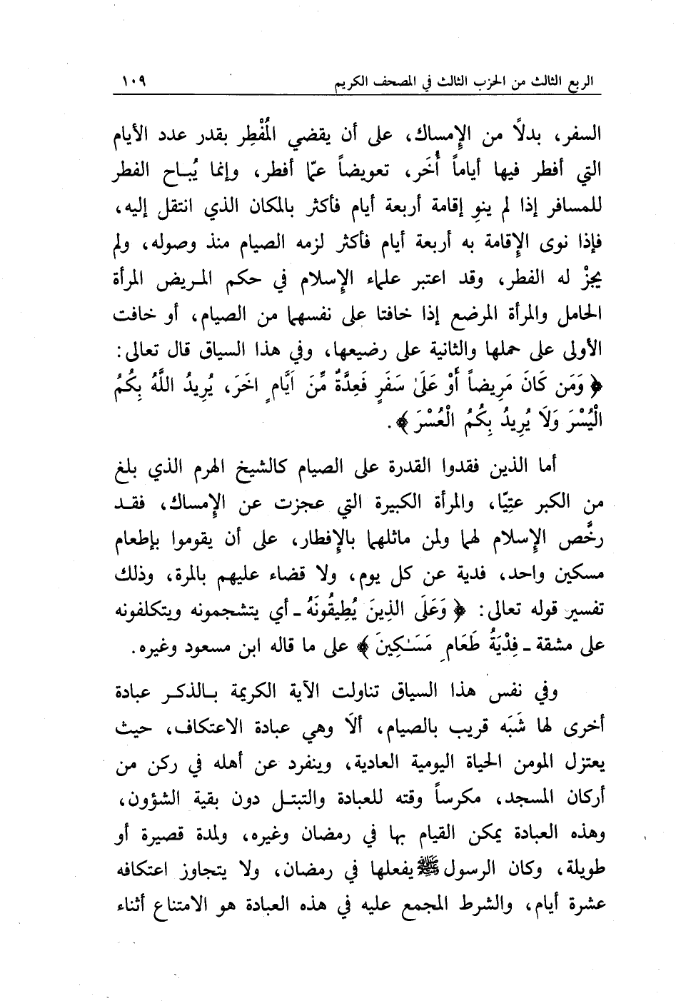 وفي نفس السياق تناولت الآية الكريمة بالذكر عبادة أخرى لها شبه قريب بالصيام، ألا وهي عبادة الاعتكاف، حيث يعتزل المؤمن الحياة اليومية العادية، وينفرد عن أهله في ركن من أركان المسجد، مكرسا وقته للعبادة والتبتل دون بقية الشؤون، وهذه العبادة يمكن القيام بها في رمضان وغيره، ولمدة قصيرة أو طويلة، وكان الرسول صلى الله عليه وسلم يفعلها في رمضان، ولا يتجاوز اعتكافه عشرة أيام، والشرط المجمع عليه في هذه العبادة هو الامتناع أثناء