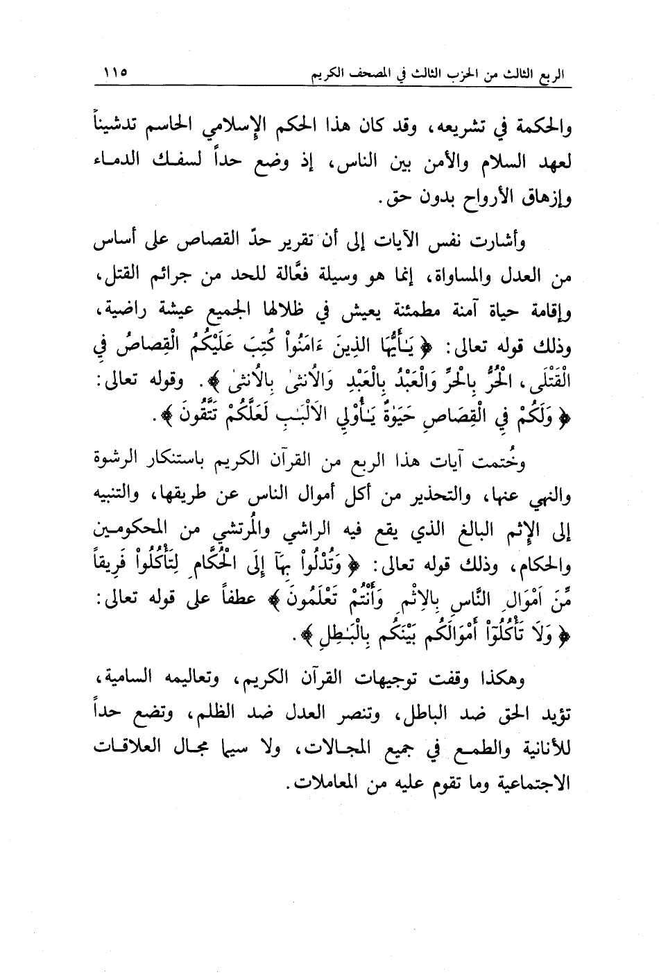 وختمت آيات هذا الربع من القرآن الكريم باستنكار الرشوة والنهي عنها، والتحذير من أكل أموال الناس عن طريقها، والتنبيه إلى الإثم البالغ الذي يقع فيه الراشي والمرتشي من المحكومين والحكام، وذلك قوله تعالى: {وَتُدْلُوا بِهَا إِلَى الْحُكَّامِ لِتَأْكُلُوا فَرِيقًا مِنْ أَمْوَالِ النَّاسِ بِالْإِثْمِ وَأَنْتُمْ تَعْلَمُونَ}. عطفا على قوله تعالى: {وَلَا تَأْكُلُوا أَمْوَالَكُمْ بَيْنَكُمْ بِالْبَاطِلِ}.