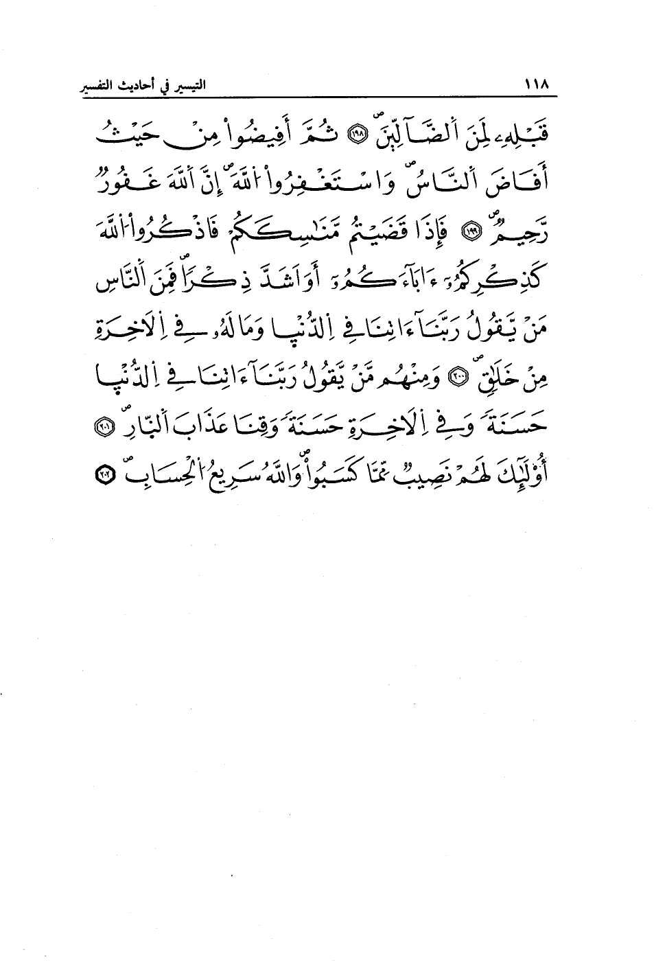 قَبْلِهِ لَمِنَ الضَّالِّينَ (198) ثُمَّ أَفِيضُوا مِنْ حَيْثُ أَفَاضَ النَّاسُ وَاسْتَغْفِرُوا اللَّهَ إِنَّ اللَّهَ غَفُورٌ رَحِيمٌ (199) فَإِذَا قَضَيْتُمْ مَنَاسِكَكُمْ فَاذْكُرُوا اللَّهَ كَذِكْرِكُمْ آبَاءَكُمْ أَوْ أَشَدَّ ذِكْرًا فَمِنَ النَّاسِ مَنْ يَقُولُ رَبَّنَا آتِنَا فِي الدُّنْيَا وَمَا لَهُ فِي الْآخِرَةِ مِنْ خَلَاقٍ (200) وَمِنْهُمْ مَنْ يَقُولُ رَبَّنَا آتِنَا فِي الدُّنْيَا حَسَنَةً وَفِي الْآخِرَةِ حَسَنَةً وَقِنَا عَذَابَ النَّارِ (201) أُولَئِكَ لَهُمْ نَصِيبٌ مِمَّا كَسَبُوا وَاللَّهُ سَرِيعُ الْحِسَابِ (202)