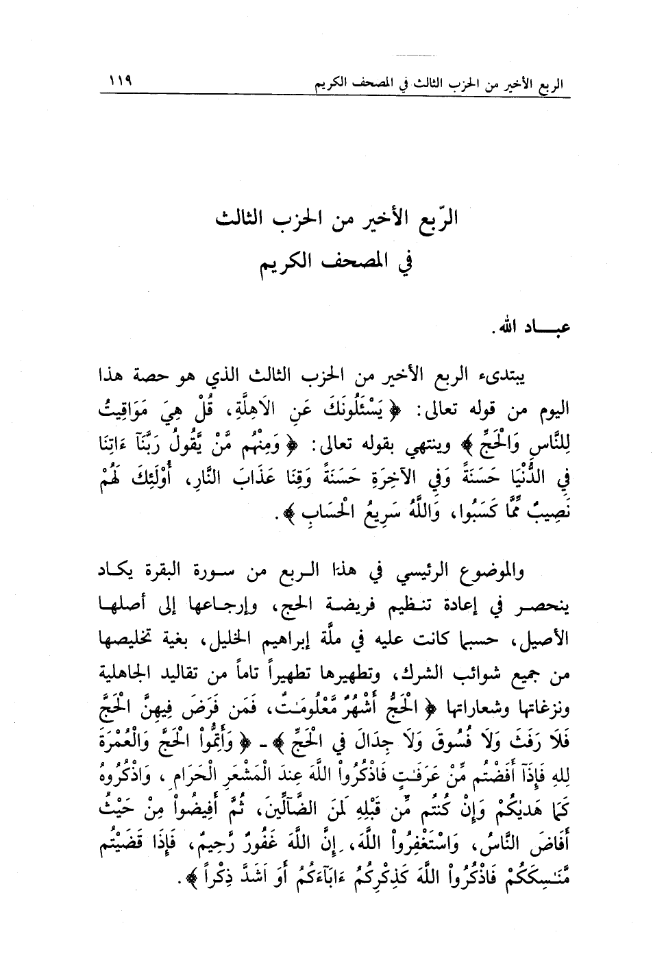 والموضوع الرئيسي في هذا الربع من سورة البقرة يكاد ينحصر في إعادة تنظيم فريضة الحج، وإرجاعها إلى أصلها الأصيل، حسبما كانت عليه في ملة إبراهيم الخليل، بغية تخليصها من جميع شوائب الشرك، وتطهيرها تطهيرا تاما من تقاليد الجاهلية ونزغاتها وشعاراتها {الْحَجُّ أَشْهُرٌ مَعْلُومَاتٌ فَمَنْ فَرَضَ فِيهِنَّ الْحَجَّ فَلَا رَفَثَ وَلَا فُسُوقَ وَلَا جِدَالَ فِي الْحَجِّ} - {وَأَتِمُّوا الْحَجَّ وَالْعُمْرَةَ لِلَّهِ - فَإِذَا أَفَضْتُمْ مِنْ عَرَفَاتٍ فَاذْكُرُوا اللَّهَ عِنْدَ الْمَشْعَرِ الْحَرَامِ وَاذْكُرُوهُ كَمَا هَدَاكُمْ وَإِنْ كُنْتُمْ مِنْ قَبْلِهِ لَمِنَ الضَّالِّينَ * ثُمَّ أَفِيضُوا مِنْ حَيْثُ أَفَاضَ النَّاسُ وَاسْتَغْفِرُوا اللَّهَ إِنَّ اللَّهَ غَفُورٌ رَحِيمٌ * فَإِذَا قَضَيْتُمْ مَنَاسِكَكُمْ فَاذْكُرُوا اللَّهَ كَذِكْرِكُمْ آبَاءَكُمْ أَوْ أَشَدَّ ذِكْرًا}.