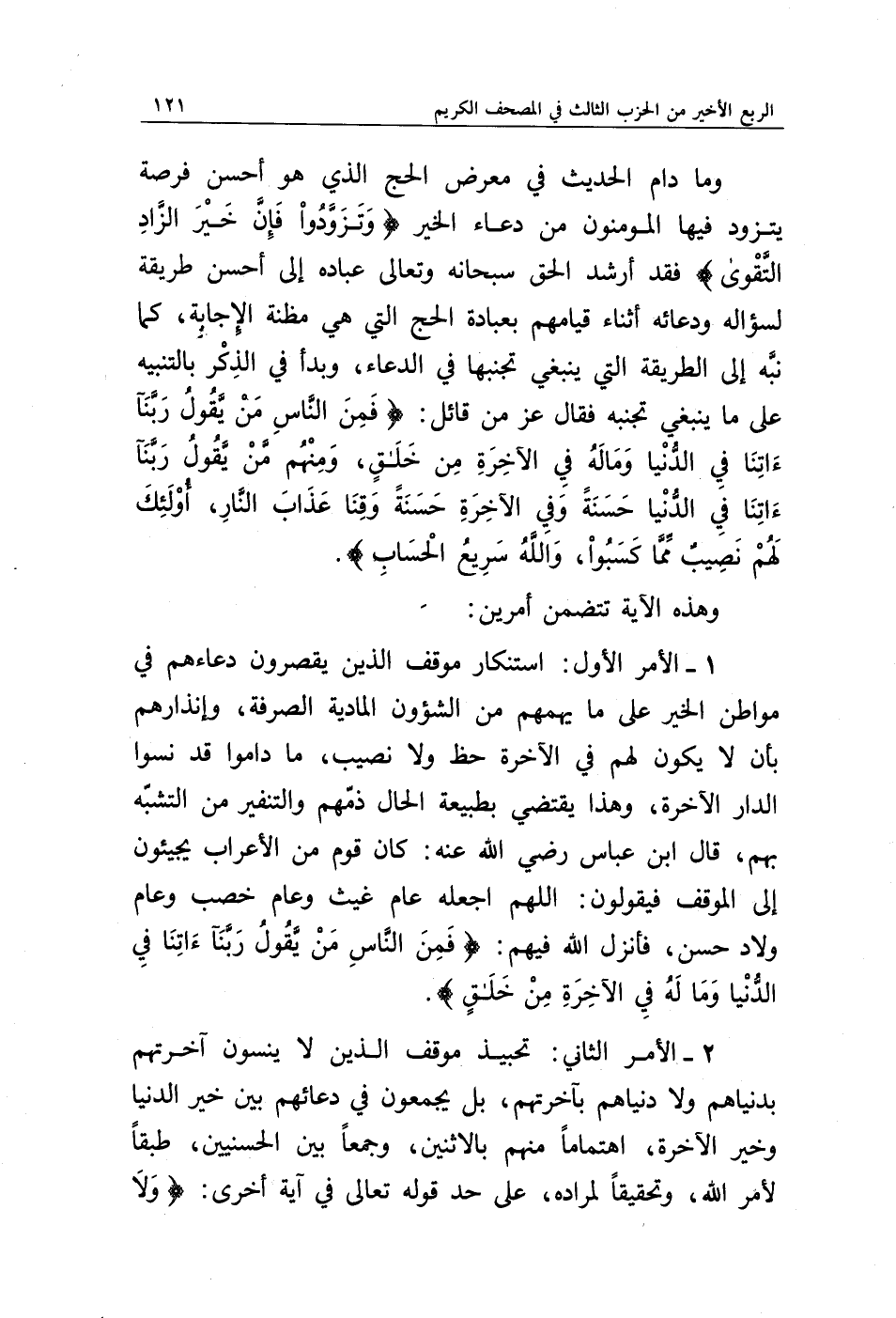 1 - الأمر الأول: استنكار موقف الذين يقصرون دعائهم في مواطن الخير على ما يهم من الشؤون المادية الصرفة، وإنذارهم بأن لا يكون لهم في الآخرة حظ ولا نصيب، ماداموا قد نسوا الدار الآخرة، وهذا يقتضي بطبيعة الحال ذمهم والتنفير من التشبه بهم، قال ابن عباس رضي الله عنه: كان قوم من الأعراب يجيئون إلى الموقف فيقولون: اللهم اجعله عام غيث وعام خصب وعام ولاد حسن، فأنزل الله فيهم {فَمِنَ النَّاسِ مَنْ يَقُولُ رَبَّنَا آتِنَا فِي الدُّنْيَا وَمَا لَهُ فِي الْآخِرَةِ مِنْ خَلَاقٍ}.