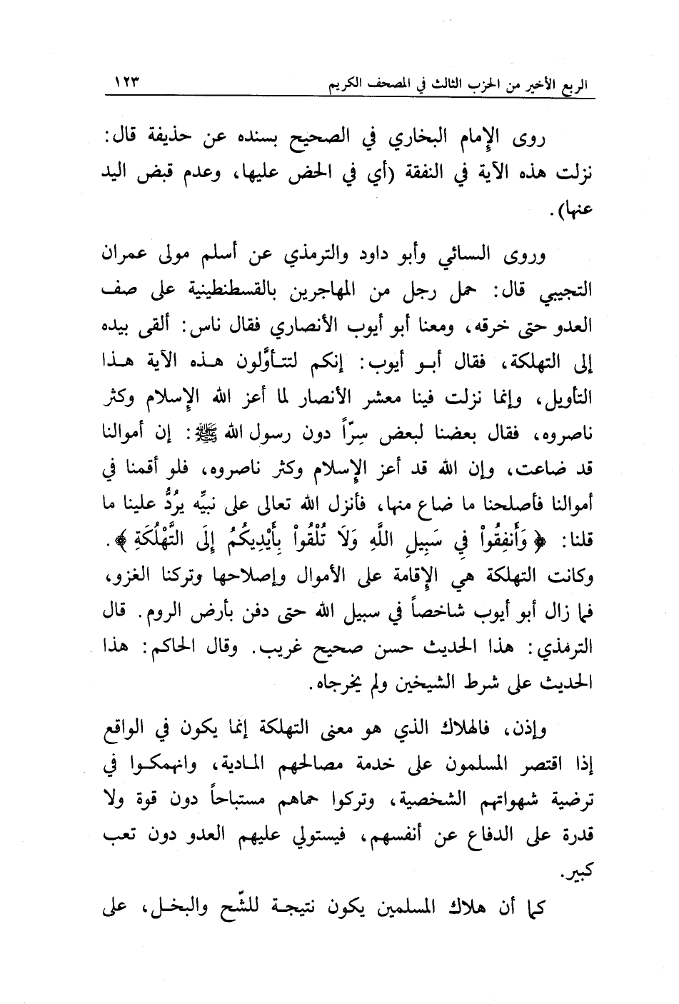 وكانت التهلكة هي الإقامة على الأموال وإصلاحها وتركنا الغزو، فما زال أبو أيوب شاخصا في سبيل الله حتى دهن بأرض الروم. قال الترمذي: " هذا الحديث حسن صحيح غريب. وقال الحاكم: هذا الحديث على شرط الشيخين ولم يخرجاه.