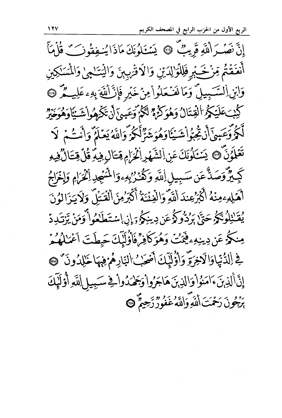 إِنَّ نَصْرَ اللَّهِ قَرِيبٌ (214) يَسْأَلُونَكَ مَاذَا يُنْفِقُونَ قُلْ مَا أَنْفَقْتُمْ مِنْ خَيْرٍ فَلِلْوَالِدَيْنِ وَالْأَقْرَبِينَ وَالْيَتَامَى وَالْمَسَاكِينِ وَابْنِ السَّبِيلِ وَمَا تَفْعَلُوا مِنْ خَيْرٍ فَإِنَّ اللَّهَ بِهِ عَلِيمٌ (215) كُتِبَ عَلَيْكُمُ الْقِتَالُ وَهُوَ كُرْهٌ لَكُمْ وَعَسَى أَنْ تَكْرَهُوا شَيْئًا وَهُوَ خَيْرٌ لَكُمْ وَعَسَى أَنْ تُحِبُّوا شَيْئًا وَهُوَ شَرٌّ لَكُمْ وَاللَّهُ يَعْلَمُ وَأَنْتُمْ لَا تَعْلَمُونَ (216) يَسْأَلُونَكَ عَنِ الشَّهْرِ الْحَرَامِ قِتَالٍ فِيهِ قُلْ قِتَالٌ فِيهِ كَبِيرٌ وَصَدٌّ عَنْ سَبِيلِ اللَّهِ وَكُفْرٌ بِهِ وَالْمَسْجِدِ الْحَرَامِ وَإِخْرَاجُ أَهْلِهِ مِنْهُ أَكْبَرُ عِنْدَ اللَّهِ وَالْفِتْنَةُ أَكْبَرُ مِنَ الْقَتْلِ وَلَا يَزَالُونَ يُقَاتِلُونَكُمْ حَتَّى يَرُدُّوكُمْ عَنْ دِينِكُمْ إِنِ اسْتَطَاعُوا وَمَنْ يَرْتَدِدْ مِنْكُمْ عَنْ دِينِهِ فَيَمُتْ وَهُوَ كَافِرٌ فَأُولَئِكَ حَبِطَتْ أَعْمَالُهُمْ فِي الدُّنْيَا وَالْآخِرَةِ وَأُولَئِكَ أَصْحَابُ النَّارِ هُمْ فِيهَا خَالِدُونَ (217) إِنَّ الَّذِينَ آمَنُوا وَالَّذِينَ هَاجَرُوا وَجَاهَدُوا فِي سَبِيلِ اللَّهِ أُولَئِكَ يَرْجُونَ رَحْمَتَ اللَّهِ وَاللَّهُ غَفُورٌ رَحِيمٌ (218)