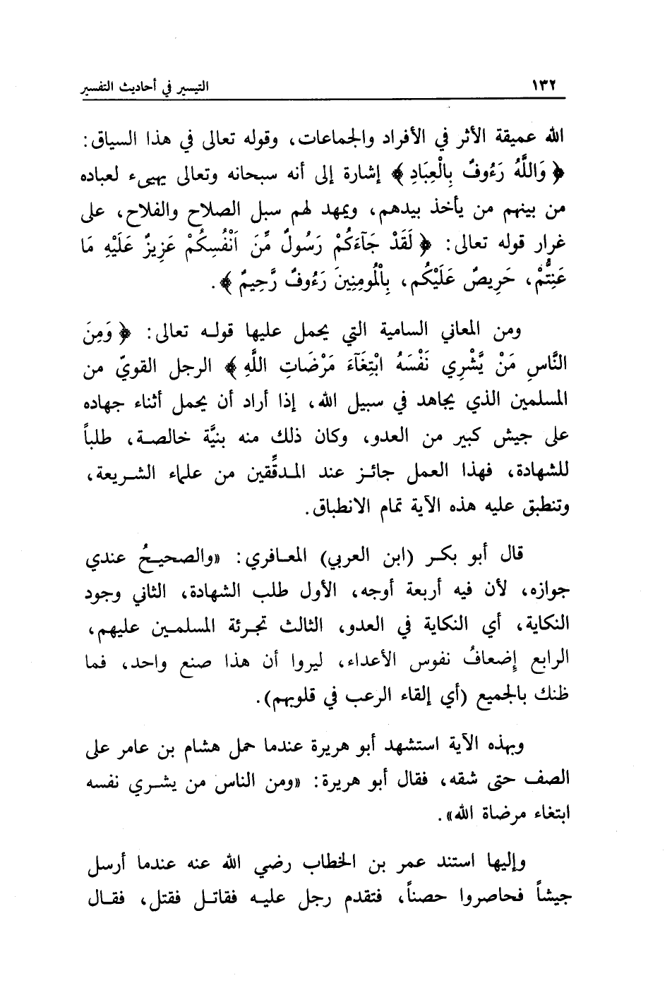 ومن المعاني السامية التي يحمل عليها قوله تعالى: {وَمِنَ النَّاسِ مَنْ يَشْرِي نَفْسَهُ ابْتِغَاءَ مَرْضَاتِ}. الرجل القوي من المسلمين الذي يجاهد في سبيل الله، إذا أراد أن يحمل أثناء جهاده على جيش كبير من العدو، وكان ذلك منه بنية خالصة، طلبا للشهادة، فهذا العمل جائز عند المدققين من علماء الشريعة، وتنطبق عليه هذه الآية تمام الانطباق.