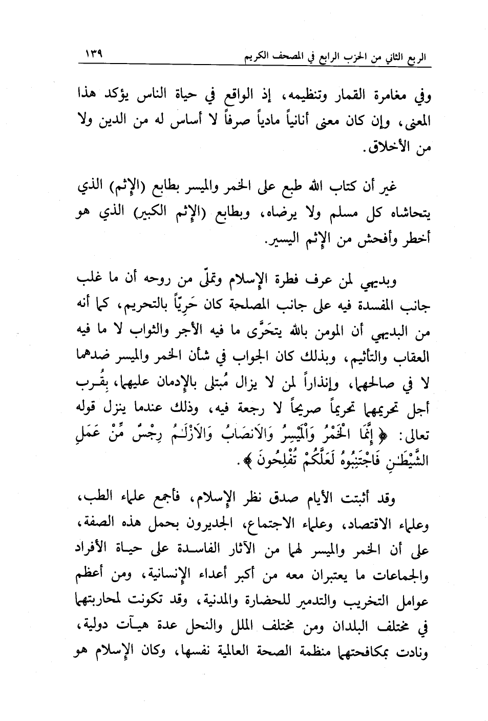 وبديهي لمن عرف فطرة الإسلام وتملى من روحه أن ما غلب جانب المفسدة فيه على جانب المصلحة كان حريا بالتحريم، كما أنه من البديهي أن المؤمن بالله يتحرى ما فيه الأجر والثواب لا ما فيه العقاب والتأثيم، وبذلك كان الجواب في شأن الخمر والميسر ضدهما لا في صالحهما، وإنذارا لمن لا يزال مبتلى بالإدمان عليهما، بقرب أجل تحريمهما تحريما صريحا لا رجعة فيه، وذلك عندما ينزل قوله تعالى: {إِنَّمَا الْخَمْرُ وَالْمَيْسِرُ وَالْأَنْصَابُ وَالْأَزْلَامُ رِجْسٌ مِنْ عَمَلِ الشَّيْطَانِ فَاجْتَنِبُوهُ لَعَلَّكُمْ تُفْلِحُونَ}.