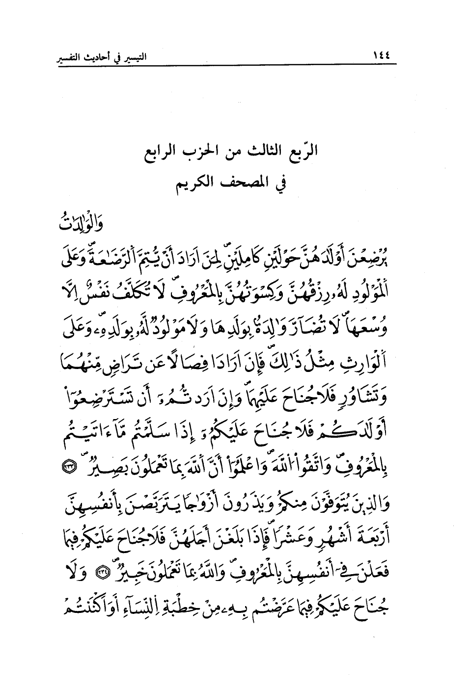 وَالْوَالِدَاتُ يُرْضِعْنَ أَوْلَادَهُنَّ حَوْلَيْنِ كَامِلَيْنِ لِمَنْ أَرَادَ أَنْ يُتِمَّ الرَّضَاعَةَ وَعَلَى الْمَوْلُودِ لَهُ رِزْقُهُنَّ وَكِسْوَتُهُنَّ بِالْمَعْرُوفِ لَا تُكَلَّفُ نَفْسٌ إِلَّا وُسْعَهَا لَا تُضَارَّ وَالِدَةٌ بِوَلَدِهَا وَلَا مَوْلُودٌ لَهُ بِوَلَدِهِ وَعَلَى الْوَارِثِ مِثْلُ ذَلِكَ فَإِنْ أَرَادَا فِصَالًا عَنْ تَرَاضٍ مِنْهُمَا وَتَشَاوُرٍ فَلَا جُنَاحَ عَلَيْهِمَا وَإِنْ أَرَدْتُمْ أَنْ تَسْتَرْضِعُوا أَوْلَادَكُمْ فَلَا جُنَاحَ عَلَيْكُمْ إِذَا سَلَّمْتُمْ مَا آتَيْتُمْ بِالْمَعْرُوفِ وَاتَّقُوا اللَّهَ وَاعْلَمُوا أَنَّ اللَّهَ بِمَا تَعْمَلُونَ بَصِيرٌ (233) وَالَّذِينَ يُتَوَفَّوْنَ مِنْكُمْ وَيَذَرُونَ أَزْوَاجًا يَتَرَبَّصْنَ بِأَنْفُسِهِنَّ أَرْبَعَةَ أَشْهُرٍ وَعَشْرًا فَإِذَا بَلَغْنَ أَجَلَهُنَّ فَلَا جُنَاحَ عَلَيْكُمْ فِيمَا فَعَلْنَ فِي أَنْفُسِهِنَّ بِالْمَعْرُوفِ وَاللَّهُ بِمَا تَعْمَلُونَ خَبِيرٌ (234) وَلَا جُنَاحَ عَلَيْكُمْ فِيمَا عَرَّضْتُمْ بِهِ مِنْ خِطْبَةِ النِّسَاءِ أَوْ أَكْنَنْتُمْ