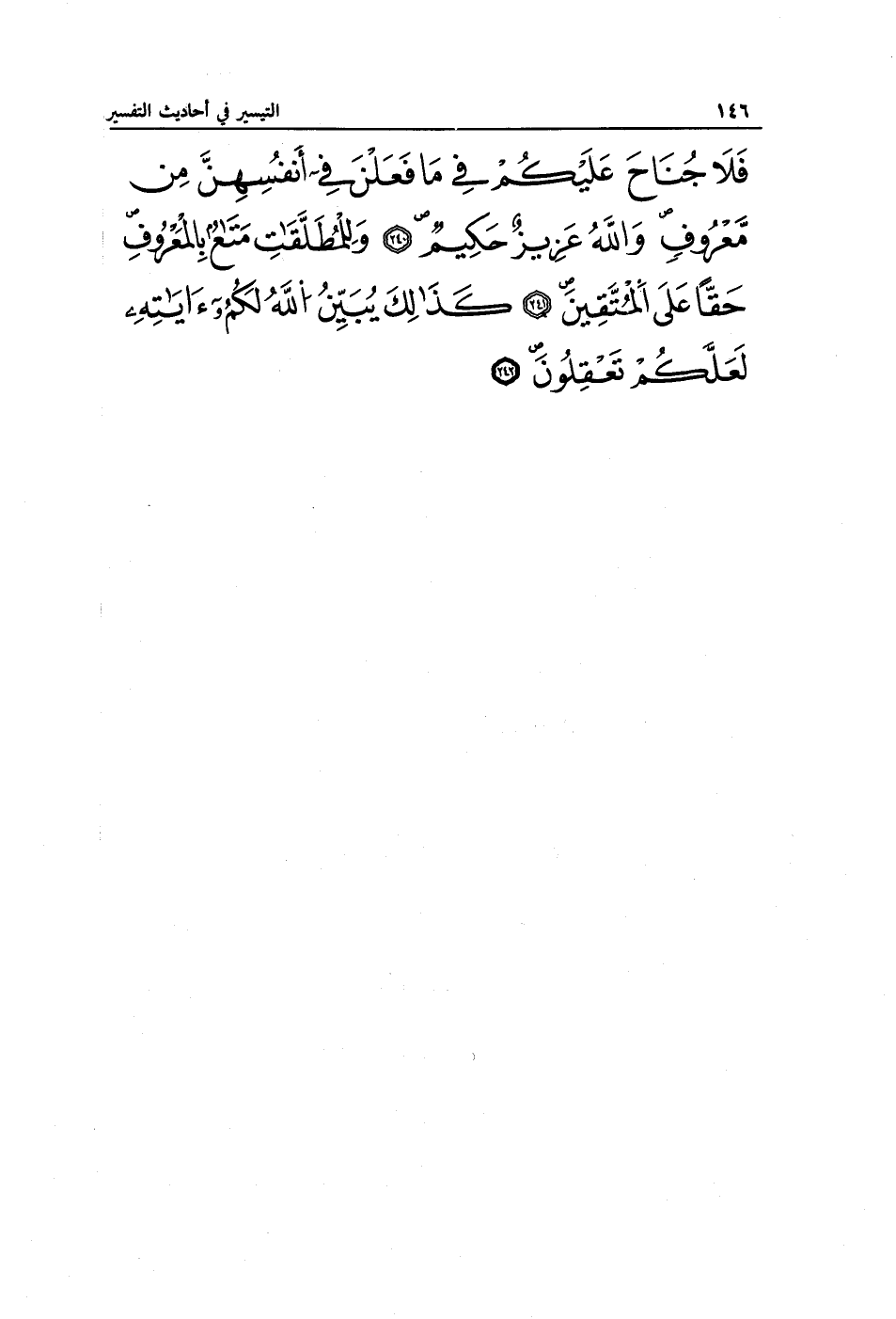 فَلَا جُنَاحَ عَلَيْكُمْ فِي مَا فَعَلْنَ فِي أَنْفُسِهِنَّ مِنْ مَعْرُوفٍ وَاللَّهُ عَزِيزٌ حَكِيمٌ (240) وَلِلْمُطَلَّقَاتِ مَتَاعٌ بِالْمَعْرُوفِ حَقًّا عَلَى الْمُتَّقِينَ (241) كَذَلِكَ يُبَيِّنُ اللَّهُ لَكُمْ آيَاتِهِ لَعَلَّكُمْ تَعْقِلُونَ (242)