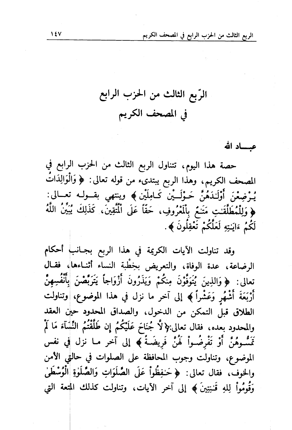 حصة هذا اليوم، تتناول الربع الثالث من الحزب الرابع في المصحف الكريم، وهذا الربع يبتدىء من قوله تعالى: {وَالْوَالِدَاتُ يُرْضِعْنَ أَوْلَادَهُنَّ حَوْلَيْنِ كَامِلَيْنِ} وينتهي بقوله تعالى: {وَلِلْمُطَلَّقَاتِ مَتَاعٌ بِالْمَعْرُوفِ حَقًّا عَلَى الْمُتَّقِينَ * كَذَلِكَ يُبَيِّنُ اللَّهُ لَكُمْ آيَاتِهِ لَعَلَّكُمْ تَعْقِلُونَ}.