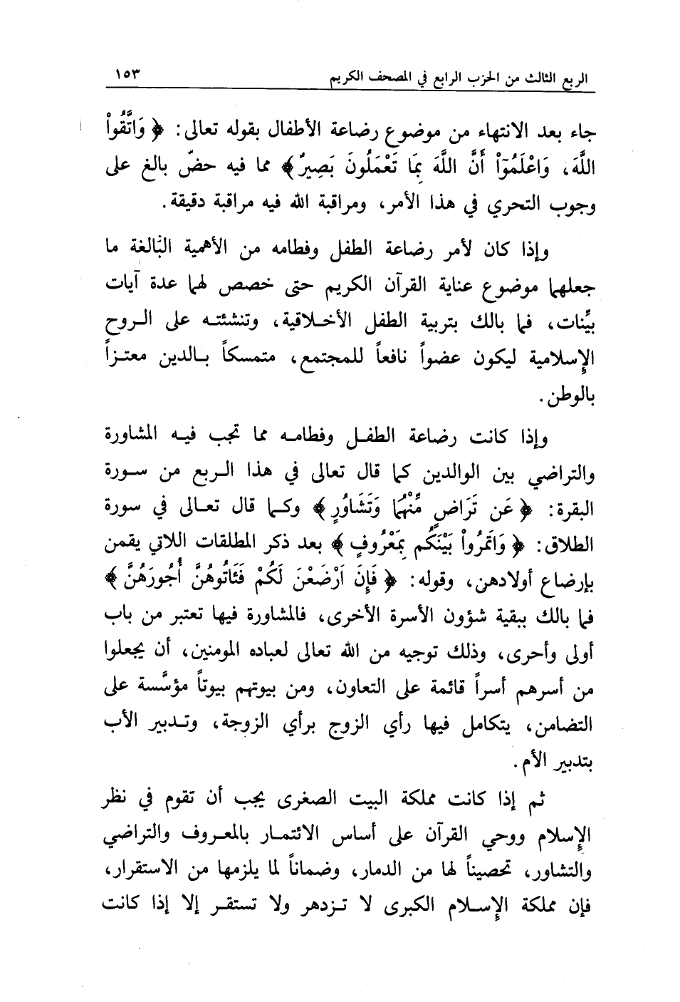 وإذا كانت رضاعة الطفل وفطامه مما تجب فيه المشاورة والتراضي بين الوالدين كما قال تعالى في هذا الربع من سورة البقرة: {عَنْ تَرَاضٍ مِنْهُمَا وَتَشَاوُرٍ}. وكما قال تعالى في سورة الطلاق {وَأْتَمِرُوا بَيْنَكُمْ بِمَعْرُوفٍ} بعد ذكر المطلقات اللاتي يقمن بإرضاع أولادهن، وقوله {فَإِنْ أَرْضَعْنَ لَكُمْ فَآتُوهُنَّ أُجُورَهُنَّ}. فما بالك ببقية شؤون الأسرة الأخرى، فالمشاورة فيها تعتبر من باب أولى وأحرى، وذلك توجيه من الله تعالى لعباده المؤمنين، أن يجعلوا من أسرهم أسرا قائمة على التعاون، ومن بيوتهم بيوتا مؤسسة على التضامن، يتكامل فيها رأي الزوج برأي الزوجة، وتدبير الأب بتدبير الأم.