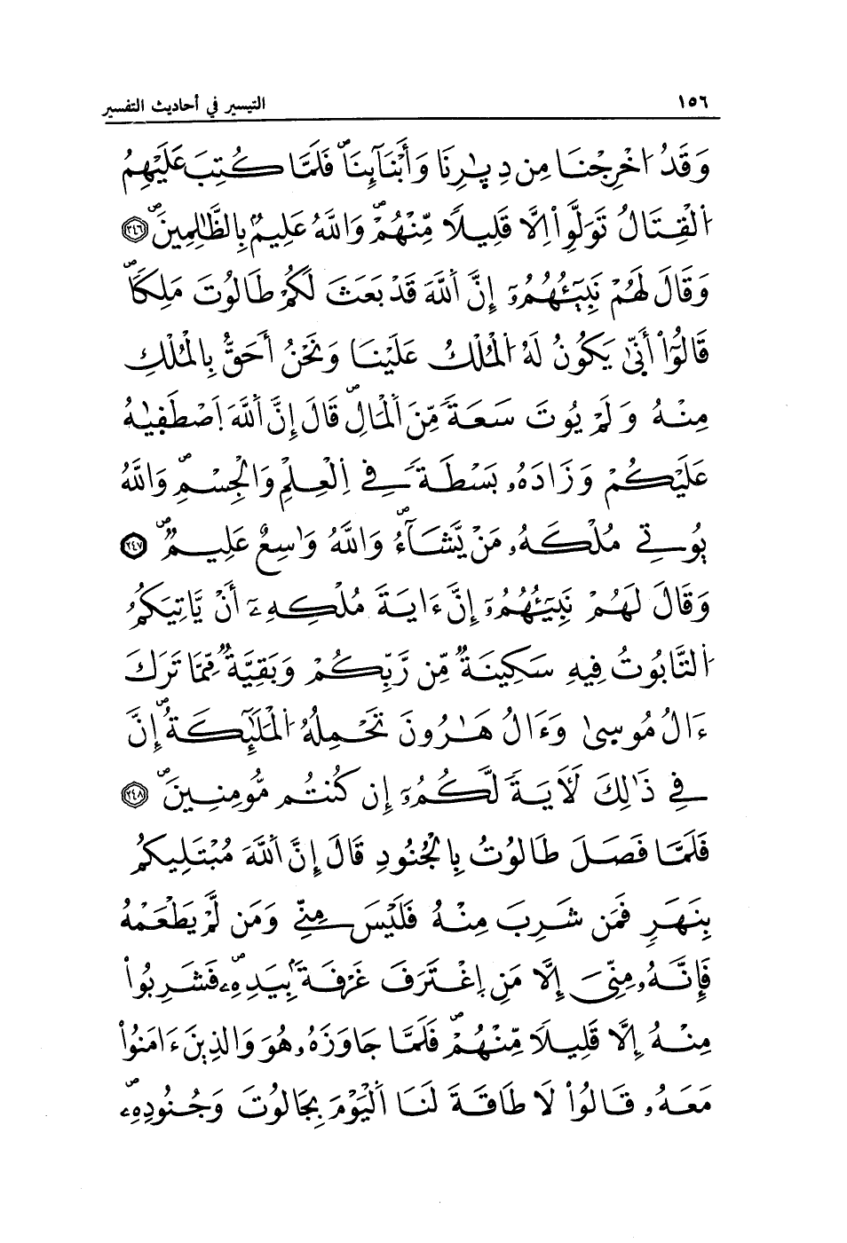 وَقَدْ أُخْرِجْنَا مِنْ دِيَارِنَا وَأَبْنَائِنَا فَلَمَّا كُتِبَ عَلَيْهِمُ الْقِتَالُ تَوَلَّوْا إِلَّا قَلِيلًا مِنْهُمْ وَاللَّهُ عَلِيمٌ بِالظَّالِمِينَ (246) وَقَالَ لَهُمْ نَبِيُّهُمْ إِنَّ اللَّهَ قَدْ بَعَثَ لَكُمْ طَالُوتَ مَلِكًا قَالُوا أَنَّى يَكُونُ لَهُ الْمُلْكُ عَلَيْنَا وَنَحْنُ أَحَقُّ بِالْمُلْكِ مِنْهُ وَلَمْ يُؤْتَ سَعَةً مِنَ الْمَالِ قَالَ إِنَّ اللَّهَ اصْطَفَاهُ عَلَيْكُمْ وَزَادَهُ بَسْطَةً فِي الْعِلْمِ وَالْجِسْمِ وَاللَّهُ يُؤْتِي مُلْكَهُ مَنْ يَشَاءُ وَاللَّهُ وَاسِعٌ عَلِيمٌ (247) وَقَالَ لَهُمْ نَبِيُّهُمْ إِنَّ آيَةَ مُلْكِهِ أَنْ يَأْتِيَكُمُ التَّابُوتُ فِيهِ سَكِينَةٌ مِنْ رَبِّكُمْ وَبَقِيَّةٌ مِمَّا تَرَكَ آلُ مُوسَى وَآلُ هَارُونَ تَحْمِلُهُ الْمَلَائِكَةُ إِنَّ فِي ذَلِكَ لَآيَةً لَكُمْ إِنْ كُنْتُمْ مُؤْمِنِينَ (248) فَلَمَّا فَصَلَ طَالُوتُ بِالْجُنُودِ قَالَ إِنَّ اللَّهَ مُبْتَلِيكُمْ بِنَهَرٍ فَمَنْ شَرِبَ مِنْهُ فَلَيْسَ مِنِّي وَمَنْ لَمْ يَطْعَمْهُ فَإِنَّهُ مِنِّي إِلَّا مَنِ اغْتَرَفَ غُرْفَةً بِيَدِهِ فَشَرِبُوا مِنْهُ إِلَّا قَلِيلًا مِنْهُمْ فَلَمَّا جَاوَزَهُ هُوَ وَالَّذِينَ آمَنُوا مَعَهُ قَالُوا لَا طَاقَةَ لَنَا الْيَوْمَ بِجَالُوتَ وَجُنُودِهِ