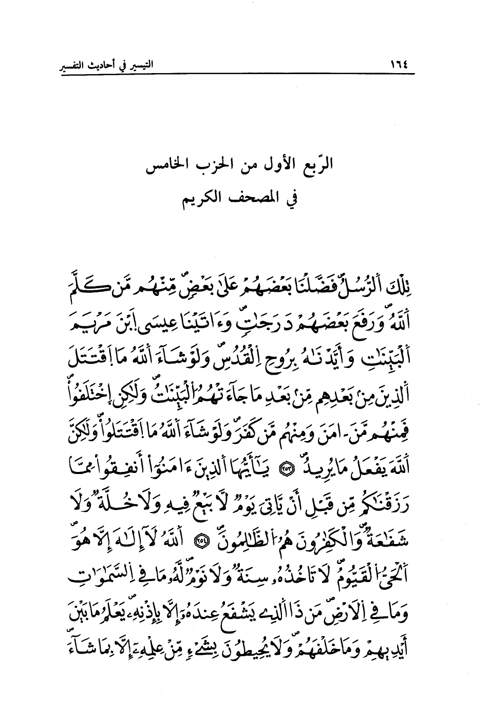 تِلْكَ الرُّسُلُ فَضَّلْنَا بَعْضَهُمْ عَلَى بَعْضٍ مِنْهُمْ مَنْ كَلَّمَ اللَّهُ وَرَفَعَ بَعْضَهُمْ دَرَجَاتٍ وَآتَيْنَا عِيسَى ابْنَ مَرْيَمَ الْبَيِّنَاتِ وَأَيَّدْنَاهُ بِرُوحِ الْقُدُسِ وَلَوْ شَاءَ اللَّهُ مَا اقْتَتَلَ الَّذِينَ مِنْ بَعْدِهِمْ مِنْ بَعْدِ مَا جَاءَتْهُمُ الْبَيِّنَاتُ وَلَكِنِ اخْتَلَفُوا فَمِنْهُمْ مَنْ آمَنَ وَمِنْهُمْ مَنْ كَفَرَ وَلَوْ شَاءَ اللَّهُ مَا اقْتَتَلُوا وَلَكِنَّ اللَّهَ يَفْعَلُ مَا يُرِيدُ (253) يَا أَيُّهَا الَّذِينَ آمَنُوا أَنْفِقُوا مِمَّا رَزَقْنَاكُمْ مِنْ قَبْلِ أَنْ يَأْتِيَ يَوْمٌ لَا بَيْعٌ فِيهِ وَلَا خُلَّةٌ وَلَا شَفَاعَةٌ وَالْكَافِرُونَ هُمُ الظَّالِمُونَ (254) اللَّهُ لَا إِلَهَ إِلَّا هُوَ الْحَيُّ الْقَيُّومُ لَا تَأْخُذُهُ سِنَةٌ وَلَا نَوْمٌ لَهُ مَا فِي السَّمَاوَاتِ وَمَا فِي الْأَرْضِ مَنْ ذَا الَّذِي يَشْفَعُ عِنْدَهُ إِلَّا بِإِذْنِهِ يَعْلَمُ مَا بَيْنَ أَيْدِيهِمْ وَمَا خَلْفَهُمْ وَلَا يُحِيطُونَ بِشَيْءٍ مِنْ عِلْمِهِ إِلَّا بِمَا شَاءَ