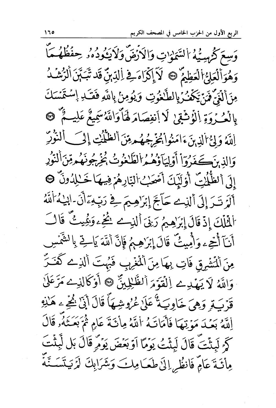 وَسِعَ كُرْسِيُّهُ السَّمَاوَاتِ وَالْأَرْضَ وَلَا يَئُودُهُ حِفْظُهُمَا وَهُوَ الْعَلِيُّ الْعَظِيمُ (255) لَا إِكْرَاهَ فِي الدِّينِ قَدْ تَبَيَّنَ الرُّشْدُ مِنَ الْغَيِّ فَمَنْ يَكْفُرْ بِالطَّاغُوتِ وَيُؤْمِنْ بِاللَّهِ فَقَدِ اسْتَمْسَكَ بِالْعُرْوَةِ الْوُثْقَى لَا انْفِصَامَ لَهَا وَاللَّهُ سَمِيعٌ عَلِيمٌ (256) اللَّهُ وَلِيُّ الَّذِينَ آمَنُوا يُخْرِجُهُمْ مِنَ الظُّلُمَاتِ إِلَى النُّورِ وَالَّذِينَ كَفَرُوا أَوْلِيَاؤُهُمُ الطَّاغُوتُ يُخْرِجُونَهُمْ مِنَ النُّورِ إِلَى الظُّلُمَاتِ أُولَئِكَ أَصْحَابُ النَّارِ هُمْ فِيهَا خَالِدُونَ (257) أَلَمْ تَرَ إِلَى الَّذِي حَاجَّ إِبْرَاهِيمَ فِي رَبِّهِ أَنْ آتَاهُ اللَّهُ الْمُلْكَ إِذْ قَالَ إِبْرَاهِيمُ رَبِّيَ الَّذِي يُحْيِي وَيُمِيتُ قَالَ أَنَا أُحْيِي وَأُمِيتُ قَالَ إِبْرَاهِيمُ فَإِنَّ اللَّهَ يَأْتِي بِالشَّمْسِ مِنَ الْمَشْرِقِ فَأْتِ بِهَا مِنَ الْمَغْرِبِ فَبُهِتَ الَّذِي كَفَرَ وَاللَّهُ لَا يَهْدِي الْقَوْمَ الظَّالِمِينَ (258) أَوْ كَالَّذِي مَرَّ عَلَى قَرْيَةٍ وَهِيَ خَاوِيَةٌ عَلَى عُرُوشِهَا قَالَ أَنَّى يُحْيِي هَذِهِ اللَّهُ بَعْدَ مَوْتِهَا فَأَمَاتَهُ اللَّهُ مِائَةَ عَامٍ ثُمَّ بَعَثَهُ قَالَ كَمْ لَبِثْتَ قَالَ لَبِثْتُ يَوْمًا أَوْ بَعْضَ يَوْمٍ قَالَ بَلْ لَبِثْتَ مِائَةَ عَامٍ فَانْظُرْ إِلَى طَعَامِكَ وَشَرَابِكَ لَمْ يَتَسَنَّهْ