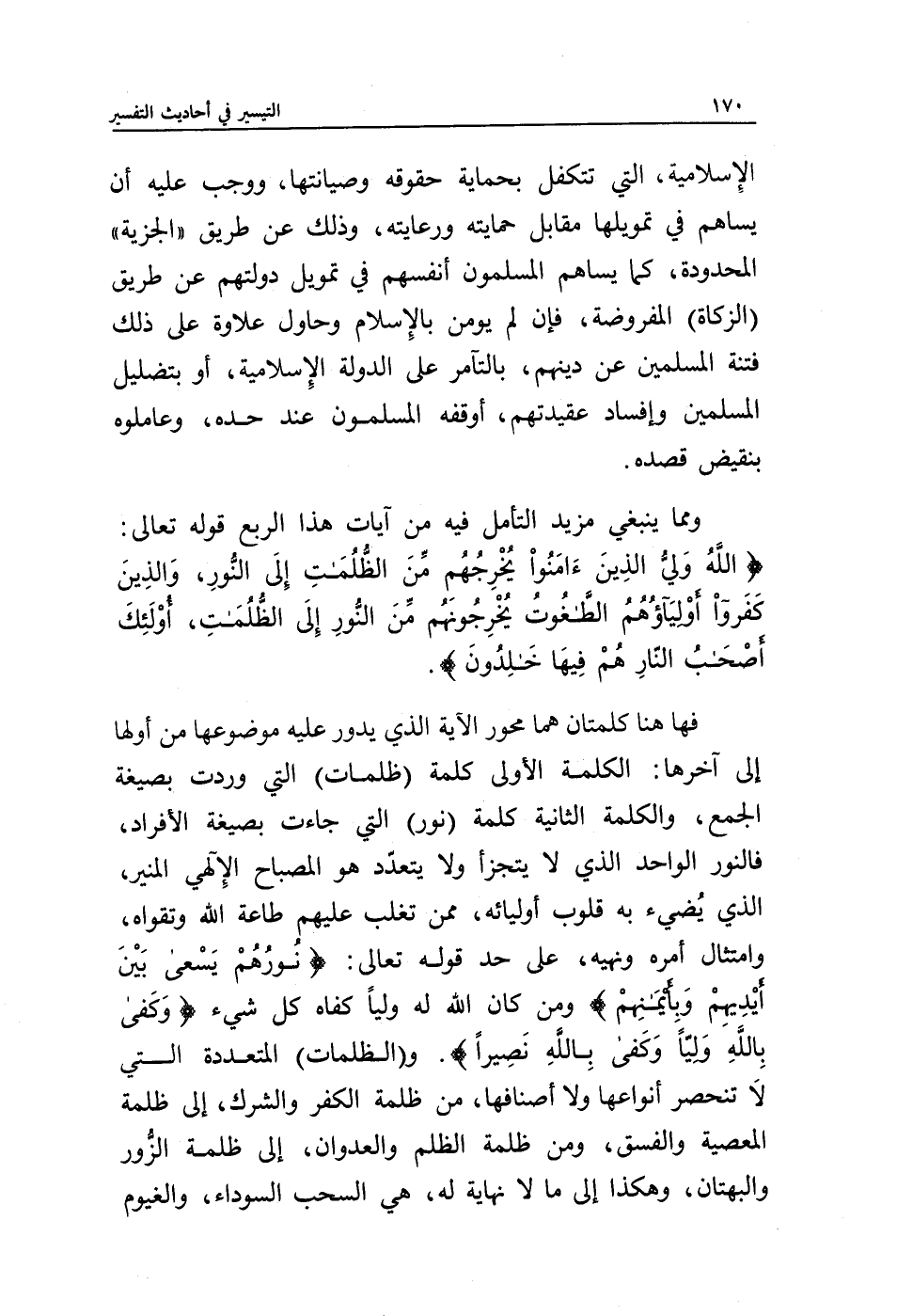 ومما ينبغي مزيد التأمل فيه من آيات هذا الربع قوله تعالى: {اللَّهُ وَلِيُّ الَّذِينَ آمَنُوا يُخْرِجُهُمْ مِنَ الظُّلُمَاتِ إِلَى النُّورِ وَالَّذِينَ كَفَرُوا أَوْلِيَاؤُهُمُ الطَّاغُوتُ يُخْرِجُونَهُمْ مِنَ النُّورِ إِلَى الظُّلُمَاتِ أُولَئِكَ أَصْحَابُ النَّارِ هُمْ فِيهَا خَالِدُونَ}.