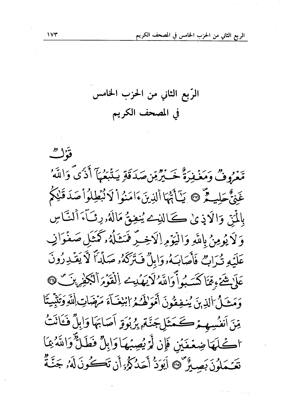 قَوْلٌ مَعْرُوفٌ وَمَغْفِرَةٌ خَيْرٌ مِنْ صَدَقَةٍ يَتْبَعُهَا أَذًى وَاللَّهُ غَنِيٌّ حَلِيمٌ (263) يَا أَيُّهَا الَّذِينَ آمَنُوا لَا تُبْطِلُوا صَدَقَاتِكُمْ بِالْمَنِّ وَالْأَذَى كَالَّذِي يُنْفِقُ مَالَهُ رِئَاءَ النَّاسِ وَلَا يُؤْمِنُ بِاللَّهِ وَالْيَوْمِ الْآخِرِ فَمَثَلُهُ كَمَثَلِ صَفْوَانٍ عَلَيْهِ تُرَابٌ فَأَصَابَهُ وَابِلٌ فَتَرَكَهُ صَلْدًا لَا يَقْدِرُونَ عَلَى شَيْءٍ مِمَّا كَسَبُوا وَاللَّهُ لَا يَهْدِي الْقَوْمَ الْكَافِرِينَ (264) وَمَثَلُ الَّذِينَ يُنْفِقُونَ أَمْوَالَهُمُ ابْتِغَاءَ مَرْضَاتِ اللَّهِ وَتَثْبِيتًا مِنْ أَنْفُسِهِمْ كَمَثَلِ جَنَّةٍ بِرَبْوَةٍ أَصَابَهَا وَابِلٌ فَآتَتْ أُكُلَهَا ضِعْفَيْنِ فَإِنْ لَمْ يُصِبْهَا وَابِلٌ فَطَلٌّ وَاللَّهُ بِمَا تَعْمَلُونَ بَصِيرٌ (265) أَيَوَدُّ أَحَدُكُمْ أَنْ تَكُونَ لَهُ جَنَّةٌ