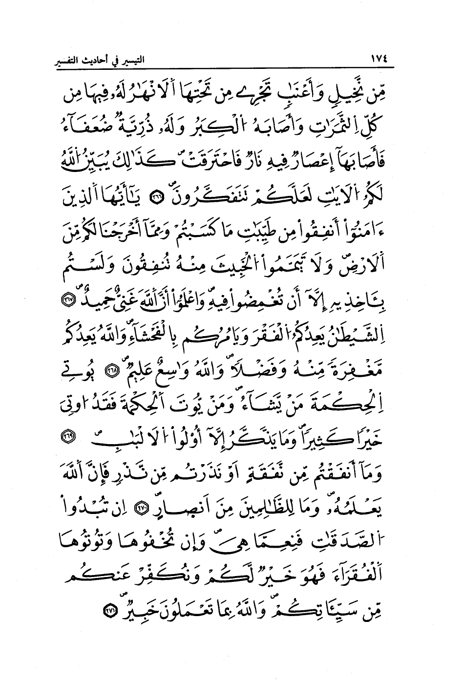 مِنْ نَخِيلٍ وَأَعْنَابٍ تَجْرِي مِنْ تَحْتِهَا الْأَنْهَارُ لَهُ فِيهَا مِنْ كُلِّ الثَّمَرَاتِ وَأَصَابَهُ الْكِبَرُ وَلَهُ ذُرِّيَّةٌ ضُعَفَاءُ فَأَصَابَهَا إِعْصَارٌ فِيهِ نَارٌ فَاحْتَرَقَتْ كَذَلِكَ يُبَيِّنُ اللَّهُ لَكُمُ الْآيَاتِ لَعَلَّكُمْ تَتَفَكَّرُونَ (266) يَا أَيُّهَا الَّذِينَ آمَنُوا أَنْفِقُوا مِنْ طَيِّبَاتِ مَا كَسَبْتُمْ وَمِمَّا أَخْرَجْنَا لَكُمْ مِنَ الْأَرْضِ وَلَا تَيَمَّمُوا الْخَبِيثَ مِنْهُ تُنْفِقُونَ وَلَسْتُمْ بِآخِذِيهِ إِلَّا أَنْ تُغْمِضُوا فِيهِ وَاعْلَمُوا أَنَّ اللَّهَ غَنِيٌّ حَمِيدٌ (267) الشَّيْطَانُ يَعِدُكُمُ الْفَقْرَ وَيَأْمُرُكُمْ بِالْفَحْشَاءِ وَاللَّهُ يَعِدُكُمْ مَغْفِرَةً مِنْهُ وَفَضْلًا وَاللَّهُ وَاسِعٌ عَلِيمٌ (268) يُؤْتِي الْحِكْمَةَ مَنْ يَشَاءُ وَمَنْ يُؤْتَ الْحِكْمَةَ فَقَدْ أُوتِيَ خَيْرًا كَثِيرًا وَمَا يَذَّكَّرُ إِلَّا أُولُو الْأَلْبَابِ (269) وَمَا أَنْفَقْتُمْ مِنْ نَفَقَةٍ أَوْ نَذَرْتُمْ مِنْ نَذْرٍ فَإِنَّ اللَّهَ يَعْلَمُهُ وَمَا لِلظَّالِمِينَ مِنْ أَنْصَارٍ (270) إِنْ تُبْدُوا الصَّدَقَاتِ فَنِعِمَّا هِيَ وَإِنْ تُخْفُوهَا وَتُؤْتُوهَا الْفُقَرَاءَ فَهُوَ خَيْرٌ لَكُمْ وَيُكَفِّرُ عَنْكُمْ مِنْ سَيِّئَاتِكُمْ وَاللَّهُ بِمَا تَعْمَلُونَ خَبِيرٌ (271)