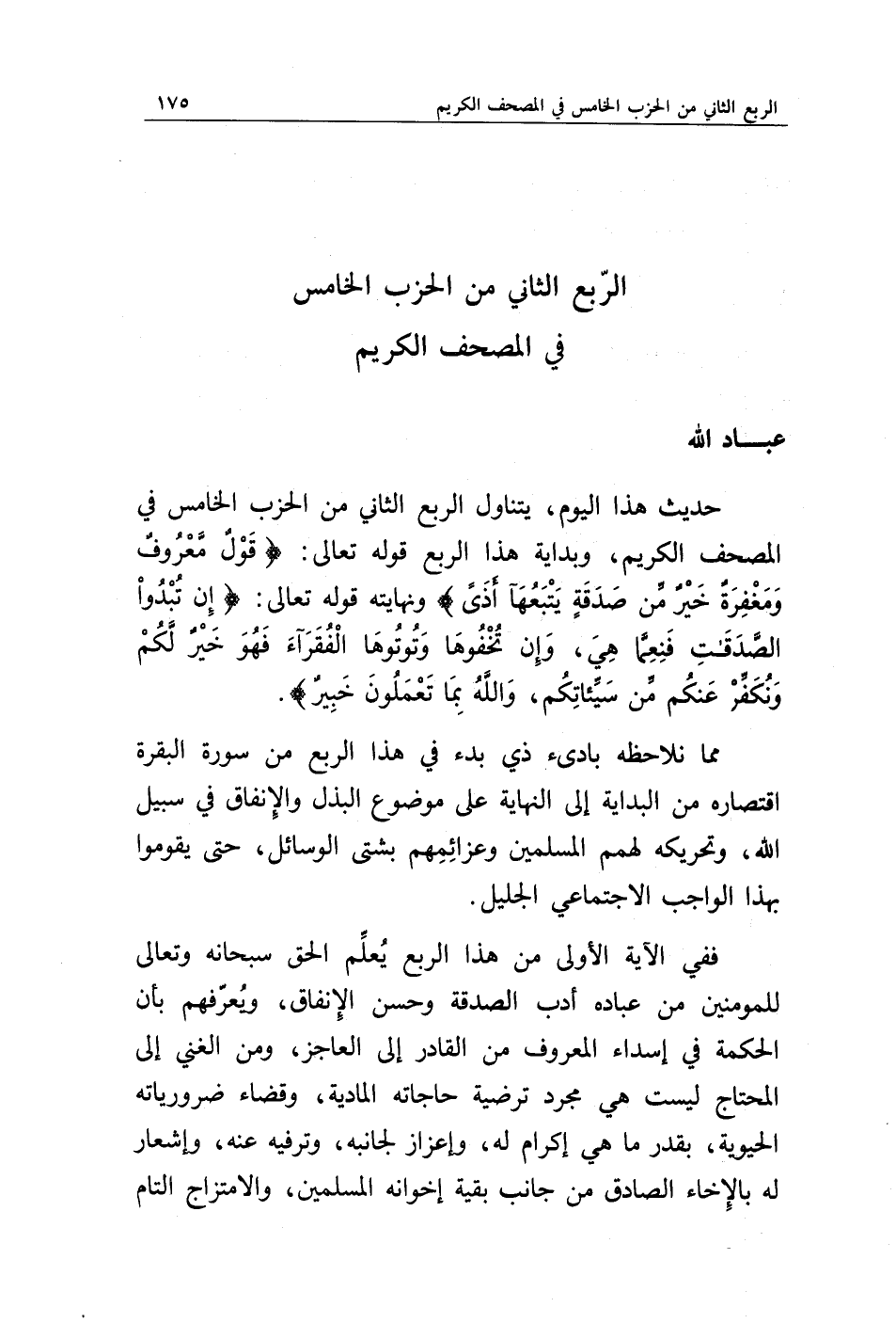 حديث هذا اليوم، يتناول الربع الثاني من الحزب الخامس في المصحف الكريم، وبداية هذا الربع قوله تعالى: {قَوْلٌ مَعْرُوفٌ وَمَغْفِرَةٌ خَيْرٌ مِنْ صَدَقَةٍ يَتْبَعُهَا أَذًى} ونهايته قوله تعالى: {إِنْ تُبْدُوا الصَّدَقَاتِ فَنِعِمَّا هِيَ وَإِنْ تُخْفُوهَا وَتُؤْتُوهَا الْفُقَرَاءَ فَهُوَ خَيْرٌ لَكُمْ وَيُكَفِّرُ عَنْكُمْ مِنْ سَيِّئَاتِكُمْ وَاللَّهُ بِمَا تَعْمَلُونَ خَبِيرٌ}.