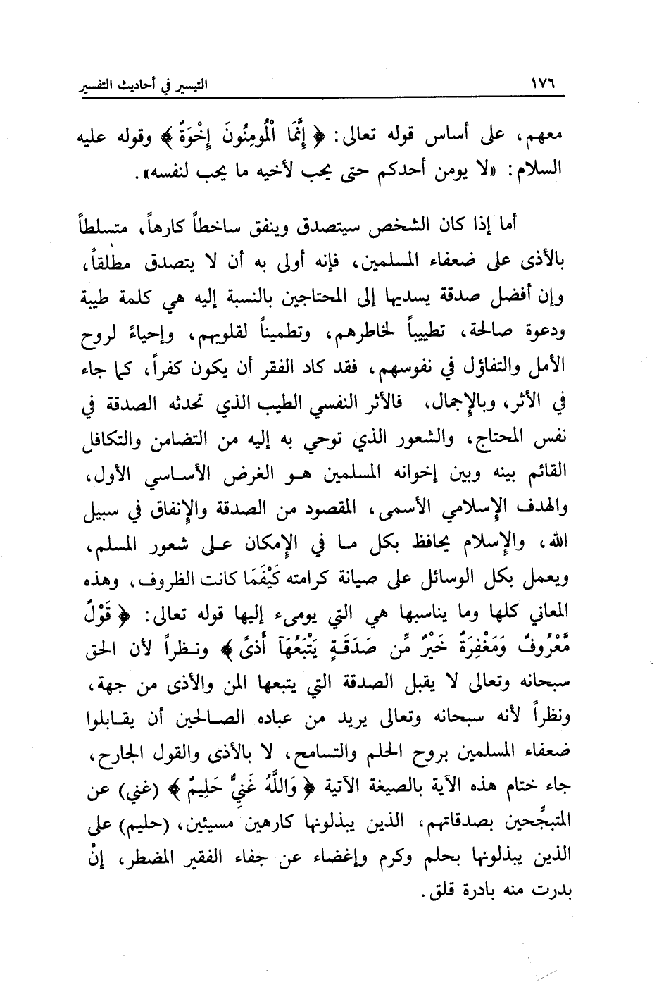 أما إذا كان الشخص سيتصدق وينفق ساخطا كارها، متسلطا بالأذى على ضعفاء المسلمين، فإنه أولى به أن لا يتصدق مطلقا، وإن أفضل صدقة يسديها إلى المحتاجين بالنسبة إليه هي كلمة طيبة ودعوة صالحة، تطييبا لخاطرهم، وتطمينا لقلوبهم، وإحياء لروح الأمل والتفاؤل في نفوسهم، فقد كاد الفقر أن يكون كفرا، كما جاء في الأثر، وبالإجمال، فالأثر النفسي الطيب الذي تحدثه الصدقة في نفس المحتاج، والشعور الذي توحي به إليه من التضامن والتكافل القائم بينه وبين إخوانه المسلمين هو الغرض الأساسي الأول، والهدف الأساسي الإسلامي الأسمى، المقصود من الصدقة والإنفاق في سبيل الله، والإسلام يحافظ بكل ما في الإمكان على شعور المسلم، ويعمل بكل الوسائل على صيانة كرامته كيفما كانت الظروف، وهذه المعاني كلها وما يناسبها هي التي يومئ إليها قوله تعالى: {قَوْلٌ مَعْرُوفٌ وَمَغْفِرَةٌ خَيْرٌ مِنْ صَدَقَةٍ يَتْبَعُهَا أَذًى}. ونظرا لأن الحق سبحانه وتعالى لا يقبل الصدقة التي يتبعها المن والأذى من جهة، ونظرا لأنه سبحانه وتعالى يريد من عباده الصالحين أن يقابلوا ضعفاء المسلمين بروح الحلم والتسامح، لا بالأذى والقول الجارح، جاء ختام هذه الآية بالصيغة الآتية {وَاللَّهُ غَنِيٌّ حَلِيمٌ}. (غني) عن المتبجحين بصدقاتهم، الذين يبذلونها كارهين مسيئين، (حليم) على الذين يبذلونها بحلم وكرم وإغضاء عن جفاء الفقير المضطر، إن بدرت منه بادرة قلق.