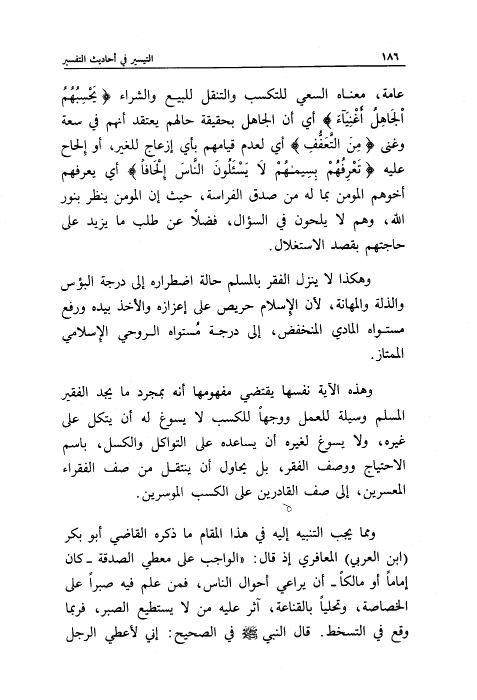 وهذه الآية نفسها يقتضي مفهومها أنه بمجرد ما يجد الفقير المسلم وسيلة للعمل ووجها للكسب لا يسوغ له أن يتكل على غيره، ولا يسوغ لغيره أن يساعده على التواكل والكسل، باسم الاحتياج ووصف الفقر، بل يحاول أن ينتقل من صف الفقراء المعسرين، إلى صف القادرين على الكسب الموسرين.