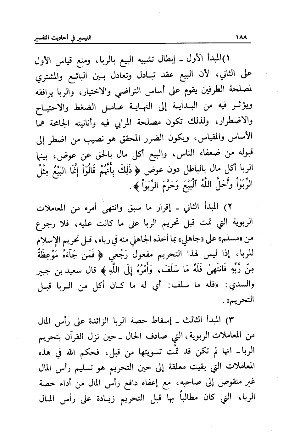 3 - المبدأ الثالث: إسقاط حصة الربا الزائدة على رأس المال من المعاملات الربوية، التي صادف الحال -حين نزل القرآن بتحريم الربا- أنها لم تكن قد تمت تسويتها من قبل، فحكم الله في هذه المعاملات التي بقيت معلقة إلى حين التحريم هو تسليم رأس المال غير منقوص إلى صاحبه، مع إعفاء دافع رأس المال من أداء حصة الربا، التي كان مطالبا بها قبل التحريم زيادة على رأس المال