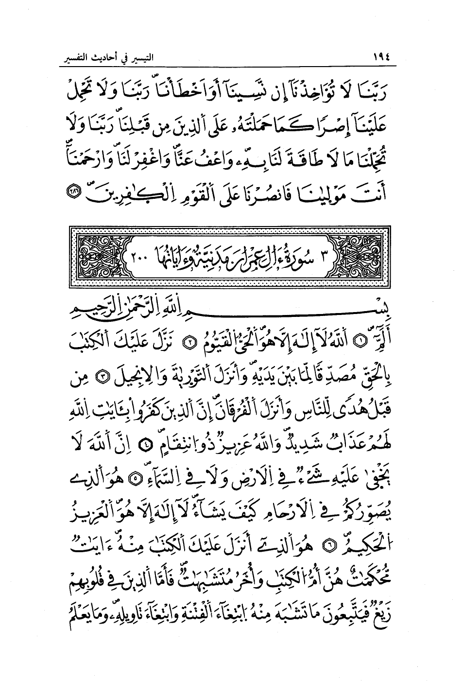 الم (1) اللَّهُ لَا إِلَهَ إِلَّا هُوَ الْحَيُّ الْقَيُّومُ (2) نَزَّلَ عَلَيْكَ الْكِتَابَ بِالْحَقِّ مُصَدِّقًا لِمَا بَيْنَ يَدَيْهِ وَأَنْزَلَ التَّوْرَاةَ وَالْإِنْجِيلَ (3) مِنْ قَبْلُ هُدًى لِلنَّاسِ وَأَنْزَلَ الْفُرْقَانَ إِنَّ الَّذِينَ كَفَرُوا بِآيَاتِ اللَّهِ لَهُمْ عَذَابٌ شَدِيدٌ وَاللَّهُ عَزِيزٌ ذُو انْتِقَامٍ (4) إِنَّ اللَّهَ لَا يَخْفَى عَلَيْهِ شَيْءٌ فِي الْأَرْضِ وَلَا فِي السَّمَاءِ (5) هُوَ الَّذِي يُصَوِّرُكُمْ فِي الْأَرْحَامِ كَيْفَ يَشَاءُ لَا إِلَهَ إِلَّا هُوَ الْعَزِيزُ الْحَكِيمُ (6) هُوَ الَّذِي أَنْزَلَ عَلَيْكَ الْكِتَابَ مِنْهُ آيَاتٌ مُحْكَمَاتٌ هُنَّ أُمُّ الْكِتَابِ وَأُخَرُ مُتَشَابِهَاتٌ فَأَمَّا الَّذِينَ فِي قُلُوبِهِمْ زَيْغٌ فَيَتَّبِعُونَ مَا تَشَابَهَ مِنْهُ ابْتِغَاءَ الْفِتْنَةِ وَابْتِغَاءَ تَأْوِيلِهِ وَمَا يَعْلَمُ