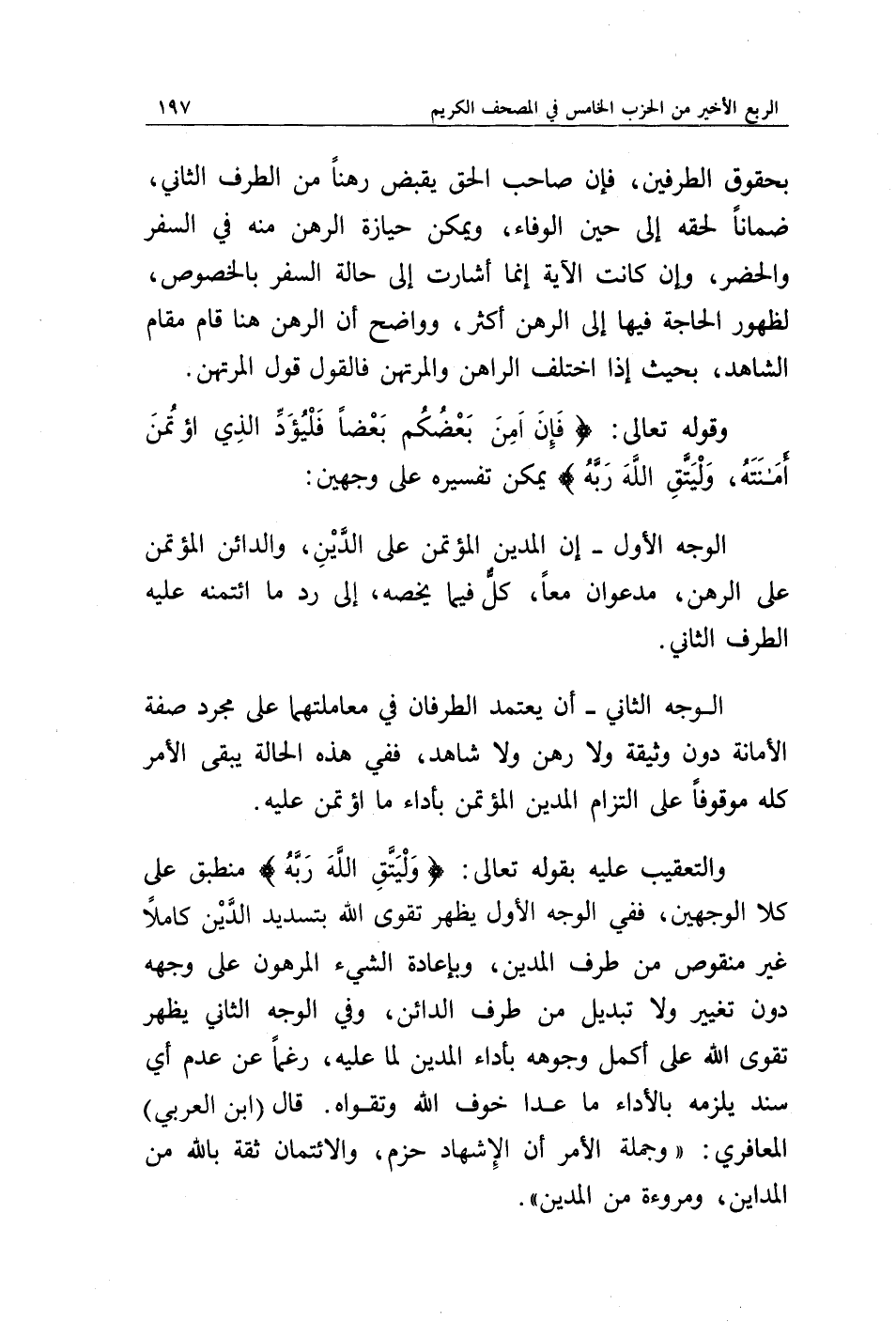 والتعقيب عليه بقوله تعالى: {وَلْيَتَّقِ اللَّهَ رَبَّهُ} منطبق على كلا الوجهين، ففي الوجه الأول يظهر تقوى الله بتسديد الدين كاملا غير منقوص من طرف المدين، وبإعادة الشيء المرهون على وجهه دون تغيير ولا تبديل من طرف الدائن، وفي الوجه الثاني يظهر تقوى الله على أكمل وجوهه بأداء المدين لما عليه، رغما عن عدم أي سند يلزمه بالأداء ما عدا خوف الله وتقواه. قال (ابن العربي) المعافري: " وجملة الأمر أن الإشهاد حزم، والائتمان ثقة بالله من المداين، ومروءة من المدين ".