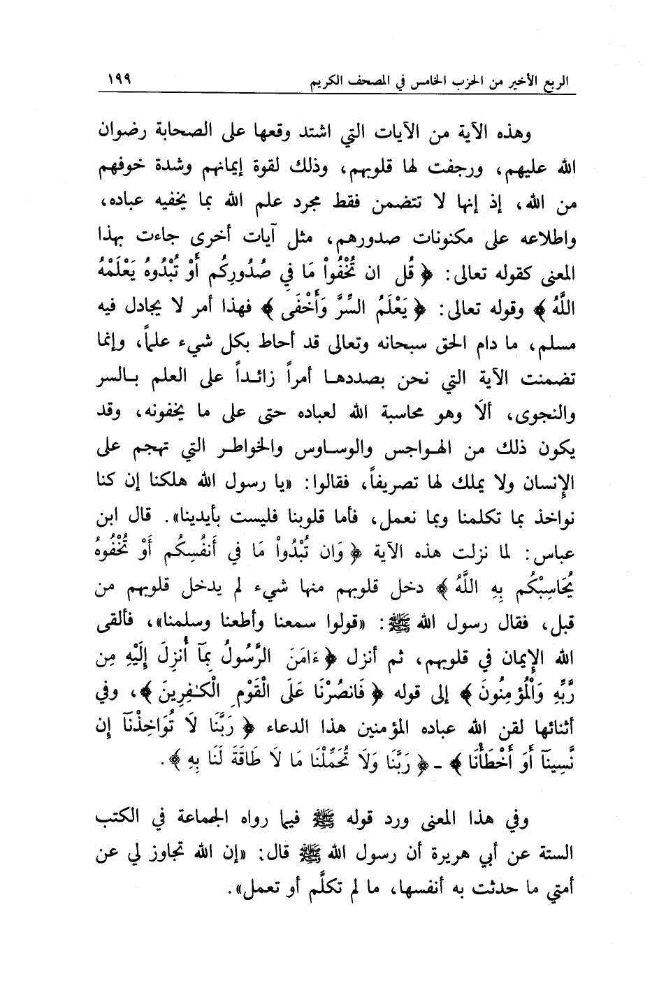 وهذه الآية من الآيات التي اشتد وقعها على الصحابة رضوان الله عليهم، ورجفت لها قلوبهم، وذلك بقوة إيمانهم وشدة خوفهم من الله، إذ إنها لا تتضمن فقط مجرد علم الله بما يخفيه عباده، واطلاعه على مكنونات صدورهم، مثل آيات أخرى جاءت بهذا المعنى كقوله تعالى: {قُلْ إِنْ تُخْفُوا مَا فِي صُدُورِكُمْ أَوْ تُبْدُوهُ يَعْلَمْهُ اللَّهُ} وقوله تعالى: {يَعْلَمُ السِّرَّ وَأَخْفَى} فهذا الأمر لا يجادل فيه مسلم، مادام الحق سبحانه وتعالى قد أحاط بكل شئ علما، وإنما تضمنت الآية التي نحن بصددها أمرا زائدا على العلم بالسر والنجوى، ألا وهو محاسبة الله لعباده حتى على ما يخفونه، وقد يكون ذلك من الهواجس والوساوس والخواطر التي تهجم على الإنسان ولا يملك لها تصريفا، فقالوا: " يا رسول الله هلكنا إن كنا نواخذ بما تكلمنا وبما نعمل، فأما قلوبنا فليست بأيدينا ". قال ابن عباس: لما نزلت هذه الآية {وَإِنْ تُبْدُوا مَا فِي أَنْفُسِكُمْ أَوْ تُخْفُوهُ يُحَاسِبْكُمْ بِهِ اللَّهُ} دخل قلوبهم منها شئ لم يدخل قلوبهم من قبل فقال رسول الله صلى الله عليه وسلم، " قولوا سمعنا وأطعنا وسلمنا "، فألقى الله الإيمان في قلوبهم، ثم أنزل {آمَنَ الرَّسُولُ بِمَا أُنْزِلَ إِلَيْهِ مِنْ رَبِّهِ وَالْمُؤْمِنُونَ} إلى قوله {فَانْصُرْنَا عَلَى الْقَوْمِ الْكَافِرِينَ}، وفي أثنائها لقن الله عباده المؤمنين هذا الدعاء {رَبَّنَا لَا تُؤَاخِذْنَا إِنْ نَسِينَا أَوْ أَخْطَأْنَا} - {رَبَّنَا وَلَا تُحَمِّلْنَا مَا لَا طَاقَةَ لَنَا بِهِ}.