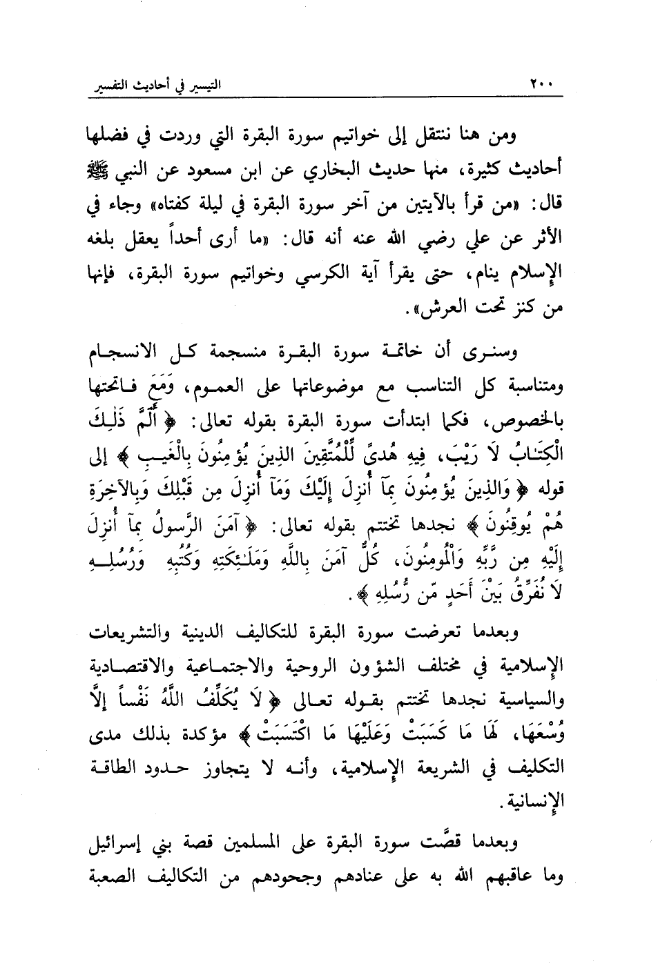وبعدما تعرضت سورة البقرة للتكاليف الدينية والتشريعات الإسلامية في مختلف الشؤون الروحية والاجتماعية والاقتصادية والسياسية نجدها تختتم بقوله تعالى: {لَا يُكَلِّفُ اللَّهُ نَفْسًا إِلَّا وُسْعَهَا لَهَا مَا كَسَبَتْ وَعَلَيْهَا مَا اكْتَسَبَتْ} مؤكدة بذلك مدى التكليف في الشريعة الإسلامية، وأنه لا يتجاوز حدود الطاقة الإنسانية.