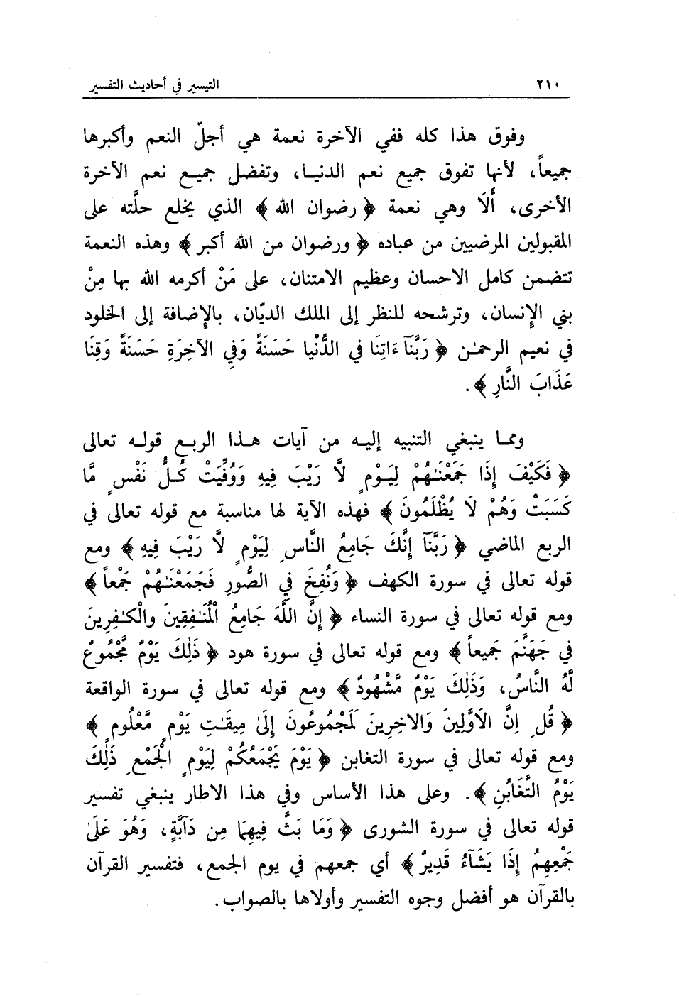 ومما ينبغي التنبيه إليه من آيات هذا الربع قوله تعالى: {فَكَيْفَ إِذَا جَمَعْنَاهُمْ لِيَوْمٍ لَا رَيْبَ فِيهِ وَوُفِّيَتْ كُلُّ نَفْسٍ مَا كَسَبَتْ وَهُمْ لَا يُظْلَمُونَ}، فهذه الآية لها مناسبة مع قوله تعالى في الربع الماضي {رَبَّنَا إِنَّكَ جَامِعُ النَّاسِ لِيَوْمٍ لَا رَيْبَ فِيهِ} ومع قوله تعالى في سورة الكهف {وَنُفِخَ فِي الصُّورِ فَجَمَعْنَاهُمْ جَمْعًا} ومع قوله تعالى في سورة النساء {إِنَّ اللَّهَ جَامِعُ الْمُنَافِقِينَ وَالْكَافِرِينَ فِي جَهَنَّمَ جَمِيعًا}، ومع قوله تعالى في سورة هود {ذَلِكَ يَوْمٌ مَجْمُوعٌ لَهُ النَّاسُ وَذَلِكَ يَوْمٌ مَشْهُودٌ}، ومع قوله تعالى في سورة الواقعة {قُلْ إِنَّ الْأَوَّلِينَ وَالْآخِرِينَ * لَمَجْمُوعُونَ إِلَى مِيقَاتِ يَوْمٍ مَعْلُومٍ}، ومع قوله تعالى في سورة التغابن {يَوْمَ يَجْمَعُكُمْ لِيَوْمِ الْجَمْعِ ذَلِكَ يَوْمُ التَّغَابُنِ}. وعلى هذا الأساس وفي هذا الإطار ينبغي تفسير قوله تعالى في سورة الشورى {وَمَا بَثَّ فِيهِمَا مِنْ دَابَّةٍ وَهُوَ عَلَى جَمْعِهِمْ إِذَا يَشَاءُ قَدِيرٌ}، أي جمعهم في يوم الجمع، فتفسير القرآن بالقرآن هو أفضل وجوه التفسير وأولاها بالصواب.