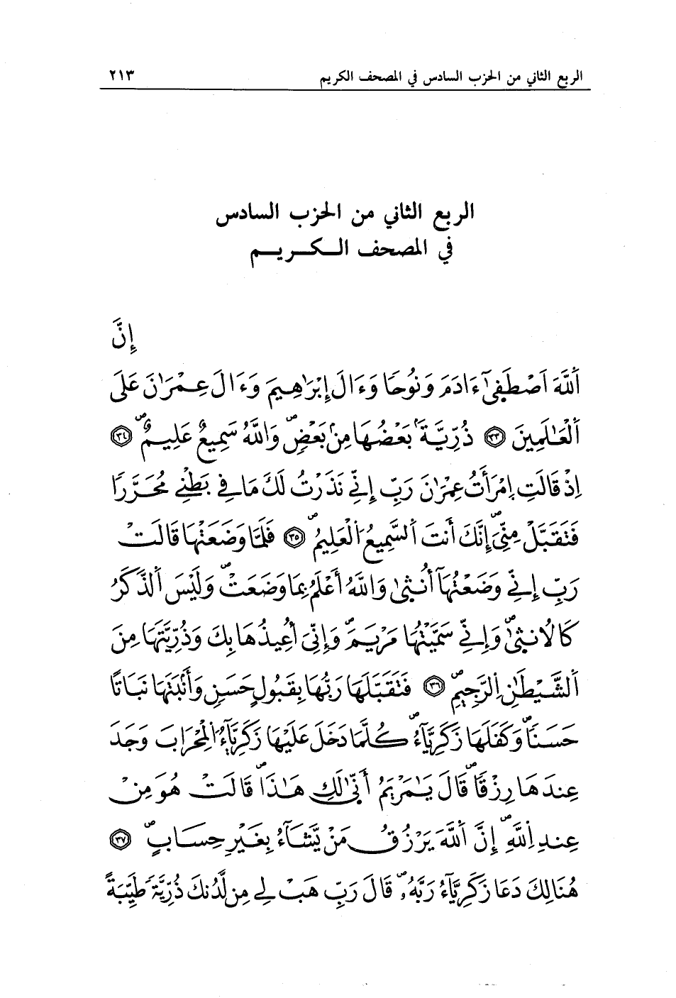 إِنَّ اللَّهَ اصْطَفَى آدَمَ وَنُوحًا وَآلَ إِبْرَاهِيمَ وَآلَ عِمْرَانَ عَلَى الْعَالَمِينَ (33) ذُرِّيَّةً بَعْضُهَا مِنْ بَعْضٍ وَاللَّهُ سَمِيعٌ عَلِيمٌ (34) إِذْ قَالَتِ امْرَأَتُ عِمْرَانَ رَبِّ إِنِّي نَذَرْتُ لَكَ مَا فِي بَطْنِي مُحَرَّرًا فَتَقَبَّلْ مِنِّي إِنَّكَ أَنْتَ السَّمِيعُ الْعَلِيمُ (35) فَلَمَّا وَضَعَتْهَا قَالَتْ رَبِّ إِنِّي وَضَعْتُهَا أُنْثَى وَاللَّهُ أَعْلَمُ بِمَا وَضَعَتْ وَلَيْسَ الذَّكَرُ كَالْأُنْثَى وَإِنِّي سَمَّيْتُهَا مَرْيَمَ وَإِنِّي أُعِيذُهَا بِكَ وَذُرِّيَّتَهَا مِنَ الشَّيْطَانِ الرَّجِيمِ (36) فَتَقَبَّلَهَا رَبُّهَا بِقَبُولٍ حَسَنٍ وَأَنْبَتَهَا نَبَاتًا حَسَنًا وَكَفَّلَهَا زَكَرِيَّا كُلَّمَا دَخَلَ عَلَيْهَا زَكَرِيَّا الْمِحْرَابَ وَجَدَ عِنْدَهَا رِزْقًا قَالَ يَا مَرْيَمُ أَنَّى لَكِ هَذَا قَالَتْ هُوَ مِنْ عِنْدِ اللَّهِ إِنَّ اللَّهَ يَرْزُقُ مَنْ يَشَاءُ بِغَيْرِ حِسَابٍ (37) هُنَالِكَ دَعَا زَكَرِيَّا رَبَّهُ قَالَ رَبِّ هَبْ لِي مِنْ لَدُنْكَ ذُرِّيَّةً طَيِّبَةً