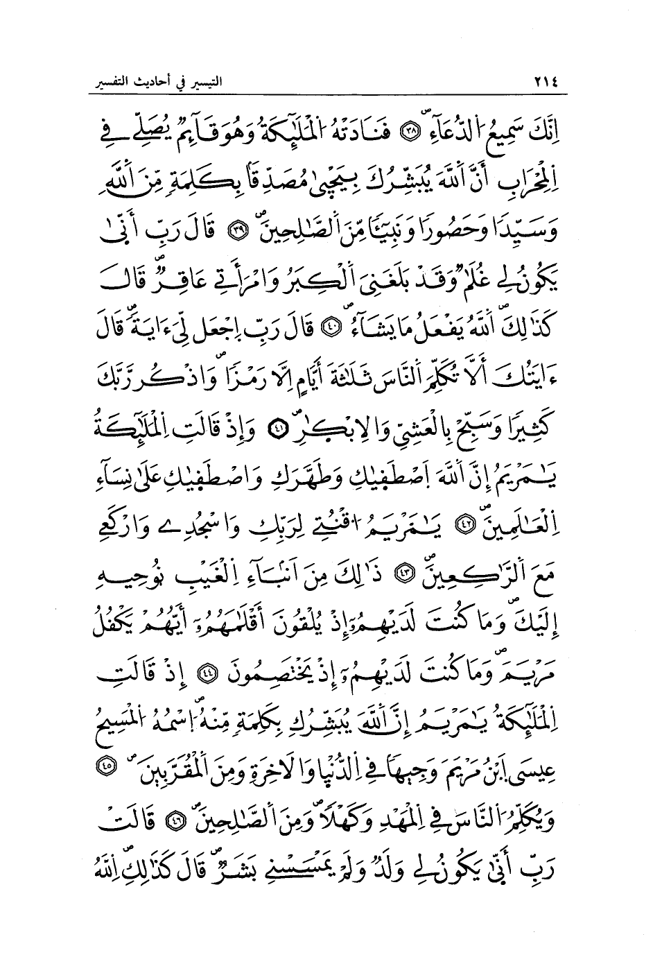 إِنَّكَ سَمِيعُ الدُّعَاءِ (38) فَنَادَتْهُ الْمَلَائِكَةُ وَهُوَ قَائِمٌ يُصَلِّي فِي الْمِحْرَابِ أَنَّ اللَّهَ يُبَشِّرُكَ بِيَحْيَى مُصَدِّقًا بِكَلِمَةٍ مِنَ اللَّهِ وَسَيِّدًا وَحَصُورًا وَنَبِيًّا مِنَ الصَّالِحِينَ (39) قَالَ رَبِّ أَنَّى يَكُونُ لِي غُلَامٌ وَقَدْ بَلَغَنِيَ الْكِبَرُ وَامْرَأَتِي عَاقِرٌ قَالَ كَذَلِكَ اللَّهُ يَفْعَلُ مَا يَشَاءُ (40) قَالَ رَبِّ اجْعَلْ لِي آيَةً قَالَ آيَتُكَ أَلَّا تُكَلِّمَ النَّاسَ ثَلَاثَةَ أَيَّامٍ إِلَّا رَمْزًا وَاذْكُرْ رَبَّكَ كَثِيرًا وَسَبِّحْ بِالْعَشِيِّ وَالْإِبْكَارِ (41) وَإِذْ قَالَتِ الْمَلَائِكَةُ يَا مَرْيَمُ إِنَّ اللَّهَ اصْطَفَاكِ وَطَهَّرَكِ وَاصْطَفَاكِ عَلَى نِسَاءِ الْعَالَمِينَ (42) يَا مَرْيَمُ اقْنُتِي لِرَبِّكِ وَاسْجُدِي وَارْكَعِي مَعَ الرَّاكِعِينَ (43) ذَلِكَ مِنْ أَنْبَاءِ الْغَيْبِ نُوحِيهِ إِلَيْكَ وَمَا كُنْتَ لَدَيْهِمْ إِذْ يُلْقُونَ أَقْلَامَهُمْ أَيُّهُمْ يَكْفُلُ مَرْيَمَ وَمَا كُنْتَ لَدَيْهِمْ إِذْ يَخْتَصِمُونَ (44) إِذْ قَالَتِ الْمَلَائِكَةُ يَا مَرْيَمُ إِنَّ اللَّهَ يُبَشِّرُكِ بِكَلِمَةٍ مِنْهُ اسْمُهُ الْمَسِيحُ عِيسَى ابْنُ مَرْيَمَ وَجِيهًا فِي الدُّنْيَا وَالْآخِرَةِ وَمِنَ الْمُقَرَّبِينَ (45) وَيُكَلِّمُ النَّاسَ فِي الْمَهْدِ وَكَهْلًا وَمِنَ الصَّالِحِينَ (46) قَالَتْ رَبِّ أَنَّى يَكُونُ لِي وَلَدٌ وَلَمْ يَمْسَسْنِي بَشَرٌ قَالَ كَذَلِكِ اللَّهُ