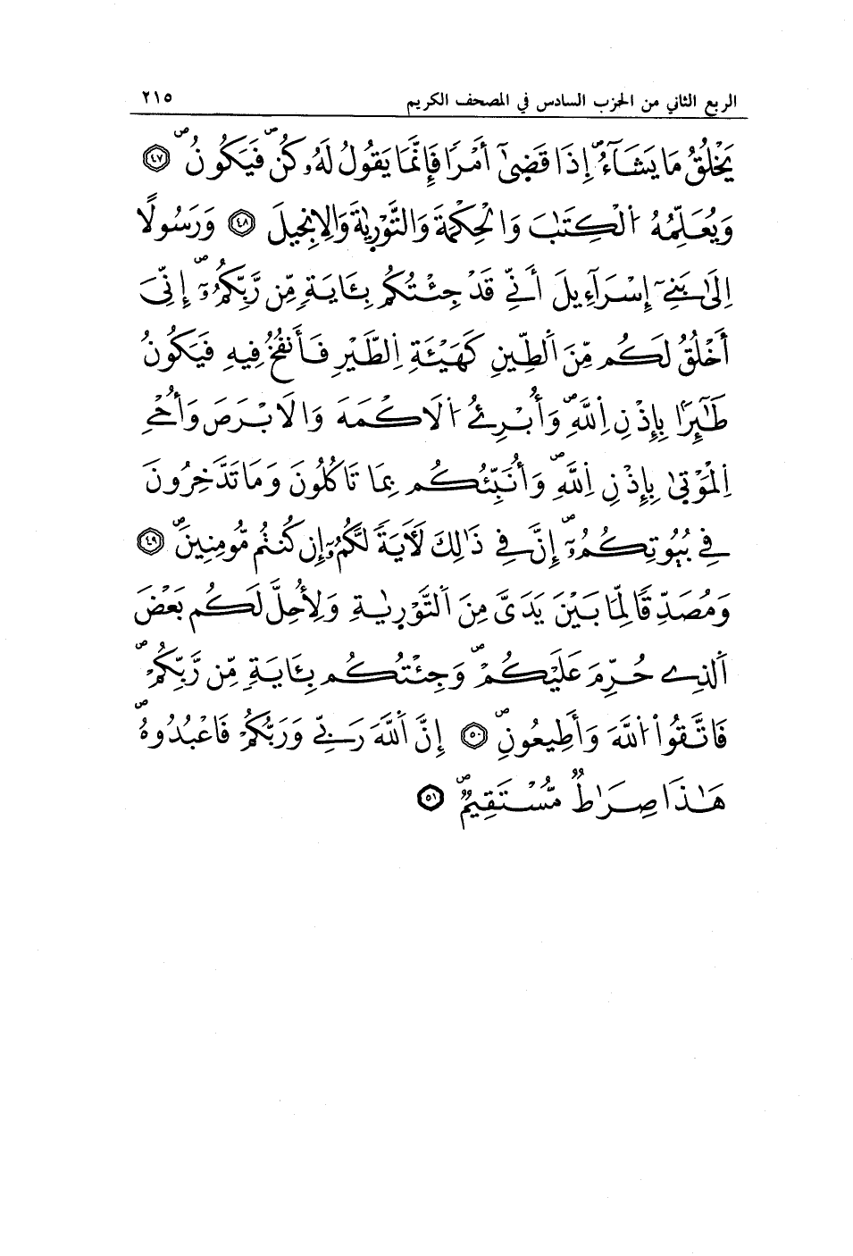 يَخْلُقُ مَا يَشَاءُ إِذَا قَضَى أَمْرًا فَإِنَّمَا يَقُولُ لَهُ كُنْ فَيَكُونُ (47) وَيُعَلِّمُهُ الْكِتَابَ وَالْحِكْمَةَ وَالتَّوْرَاةَ وَالْإِنْجِيلَ (48) وَرَسُولًا إِلَى بَنِي إِسْرَائِيلَ أَنِّي قَدْ جِئْتُكُمْ بِآيَةٍ مِنْ رَبِّكُمْ أَنِّي أَخْلُقُ لَكُمْ مِنَ الطِّينِ كَهَيْئَةِ الطَّيْرِ فَأَنْفُخُ فِيهِ فَيَكُونُ طَيْرًا بِإِذْنِ اللَّهِ وَأُبْرِئُ الْأَكْمَهَ وَالْأَبْرَصَ وَأُحْيِ الْمَوْتَى بِإِذْنِ اللَّهِ وَأُنَبِّئُكُمْ بِمَا تَأْكُلُونَ وَمَا تَدَّخِرُونَ فِي بُيُوتِكُمْ إِنَّ فِي ذَلِكَ لَآيَةً لَكُمْ إِنْ كُنْتُمْ مُؤْمِنِينَ (49) وَمُصَدِّقًا لِمَا بَيْنَ يَدَيَّ مِنَ التَّوْرَاةِ وَلِأُحِلَّ لَكُمْ بَعْضَ الَّذِي حُرِّمَ عَلَيْكُمْ وَجِئْتُكُمْ بِآيَةٍ مِنْ رَبِّكُمْ فَاتَّقُوا اللَّهَ وَأَطِيعُونِ (50) إِنَّ اللَّهَ رَبِّي وَرَبُّكُمْ فَاعْبُدُوهُ هَذَا صِرَاطٌ مُسْتَقِيمٌ (51)