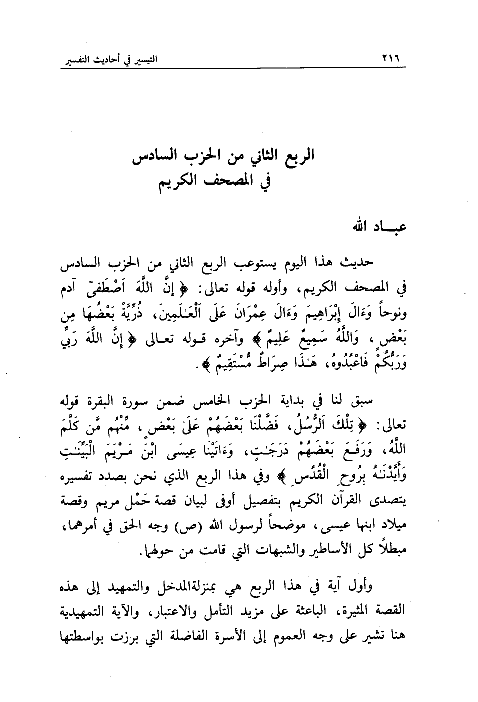 حديث هذا اليوم يستوعب الربع الثاني من الحزب السادس في المصحف الكريم، وأوله قوله تعالى: {إِنَّ اللَّهَ اصْطَفَى آدَمَ وَنُوحًا وَآلَ إِبْرَاهِيمَ وَآلَ عِمْرَانَ عَلَى الْعَالَمِينَ (33) ذُرِّيَّةً بَعْضُهَا مِنْ بَعْضٍ وَاللَّهُ سَمِيعٌ عَلِيمٌ} وآخره قوله تعالى: {إِنَّ اللَّهَ رَبِّي وَرَبُّكُمْ فَاعْبُدُوهُ هَذَا صِرَاطٌ مُسْتَقِيمٌ}.
