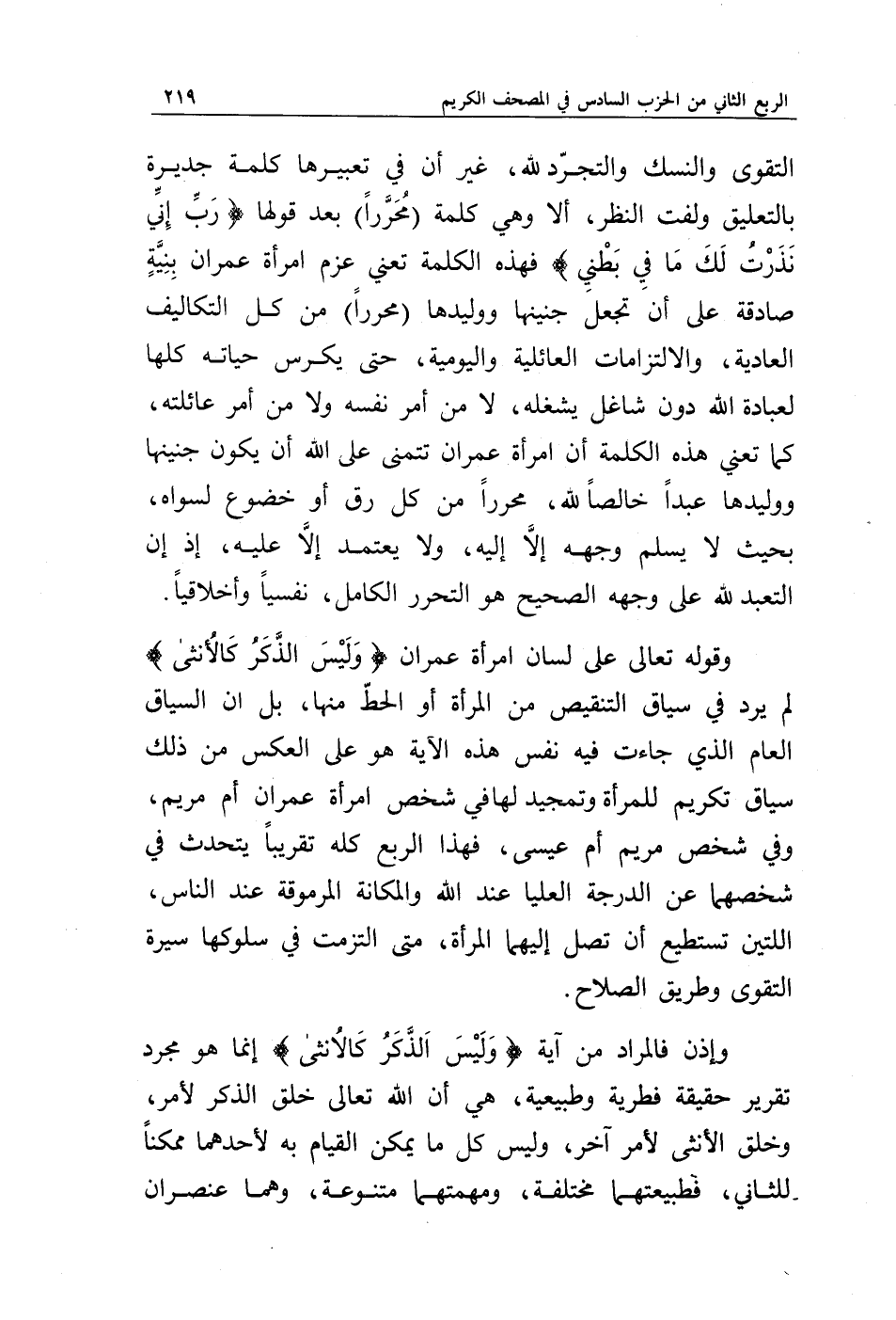 وقوله تعالى على لسان امرأة عمران {وَلَيْسَ الذَّكَرُ كَالْأُنْثَى} لم يرد في سياق التنقيص من المرأة أو الحط منها، بل إن السياق العام الذي جاءت فيه نفس هذه الآية هو على العكس من ذلك سياق تكريم للمرأة وتمجيد لها في شخص امرأة عمران أم مريم، وفي شخص مريم أم عيسى، فهذا الربع كله تقريبا يتحدث في شخصهما عن الدرجة العليا عند الله والمكانة المرموقة عند الناس، اللتين تستطيع أن تصل إليهما المرأة، متى التزمت في سلوكها سيرة التقوى وطريق الصلاح.