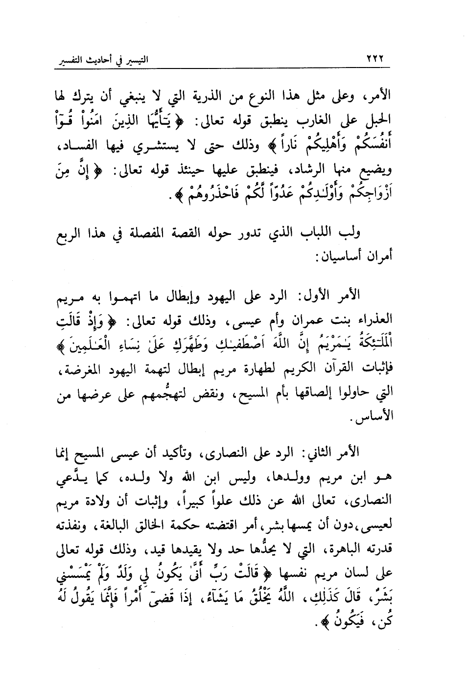 الأمر الثاني: الرد على النصارى، وتأكيد أن عيسى المسيح إنما هو ابن مريم وولدها، وليس ابن الله ولا ولده، كما يدعي النصارى، تعالى الله عن ذلك علوا كبيرا، وإثبات أن ولادة مريم لعيسى، دون أن يمسها بشر، أمر اقتضته حكمة الخالق البالغة، ونفذته قدرته الباهرة، التي لا يحدها حد ولا يقيدها قيد، وذلك قوله تعالى على لسان مريم نفسها {قَالَتْ رَبِّ أَنَّى يَكُونُ لِي وَلَدٌ وَلَمْ يَمْسَسْنِي بَشَرٌ قَالَ كَذَلِكِ اللَّهُ يَخْلُقُ مَا يَشَاءُ إِذَا قَضَى أَمْرًا فَإِنَّمَا يَقُولُ لَهُ كُنْ فَيَكُونُ}.