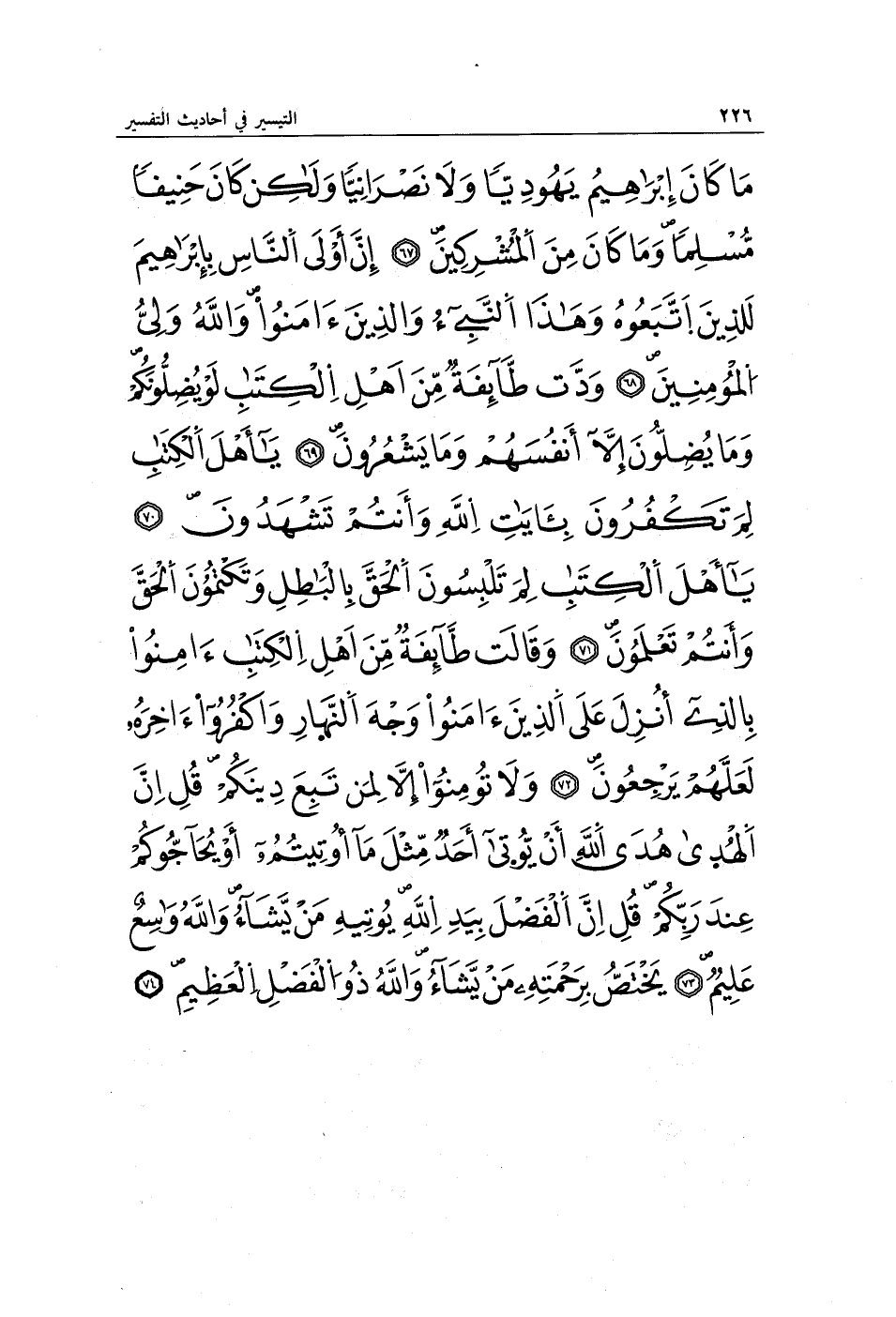 مَا كَانَ إِبْرَاهِيمُ يَهُودِيًّا وَلَا نَصْرَانِيًّا وَلَكِنْ كَانَ حَنِيفًا مُسْلِمًا وَمَا كَانَ مِنَ الْمُشْرِكِينَ (67) إِنَّ أَوْلَى النَّاسِ بِإِبْرَاهِيمَ لَلَّذِينَ اتَّبَعُوهُ وَهَذَا النَّبِيُّ وَالَّذِينَ آمَنُوا وَاللَّهُ وَلِيُّ الْمُؤْمِنِينَ (68) وَدَّتْ طَائِفَةٌ مِنْ أَهْلِ الْكِتَابِ لَوْ يُضِلُّونَكُمْ وَمَا يُضِلُّونَ إِلَّا أَنْفُسَهُمْ وَمَا يَشْعُرُونَ (69) يَا أَهْلَ الْكِتَابِ لِمَ تَكْفُرُونَ بِآيَاتِ اللَّهِ وَأَنْتُمْ تَشْهَدُونَ (70) يَا أَهْلَ الْكِتَابِ لِمَ تَلْبِسُونَ الْحَقَّ بِالْبَاطِلِ وَتَكْتُمُونَ الْحَقَّ وَأَنْتُمْ تَعْلَمُونَ (71) وَقَالَتْ طَائِفَةٌ مِنْ أَهْلِ الْكِتَابِ آمِنُوا بِالَّذِي أُنْزِلَ عَلَى الَّذِينَ آمَنُوا وَجْهَ النَّهَارِ وَاكْفُرُوا آخِرَهُ لَعَلَّهُمْ يَرْجِعُونَ (72) وَلَا تُؤْمِنُوا إِلَّا لِمَنْ تَبِعَ دِينَكُمْ قُلْ إِنَّ الْهُدَى هُدَى اللَّهِ أَنْ يُؤْتَى أَحَدٌ مِثْلَ مَا أُوتِيتُمْ أَوْ يُحَاجُّوكُمْ عِنْدَ رَبِّكُمْ قُلْ إِنَّ الْفَضْلَ بِيَدِ اللَّهِ يُؤْتِيهِ مَنْ يَشَاءُ وَاللَّهُ وَاسِعٌ عَلِيمٌ (73) يَخْتَصُّ بِرَحْمَتِهِ مَنْ يَشَاءُ وَاللَّهُ ذُو الْفَضْلِ الْعَظِيمِ (74)