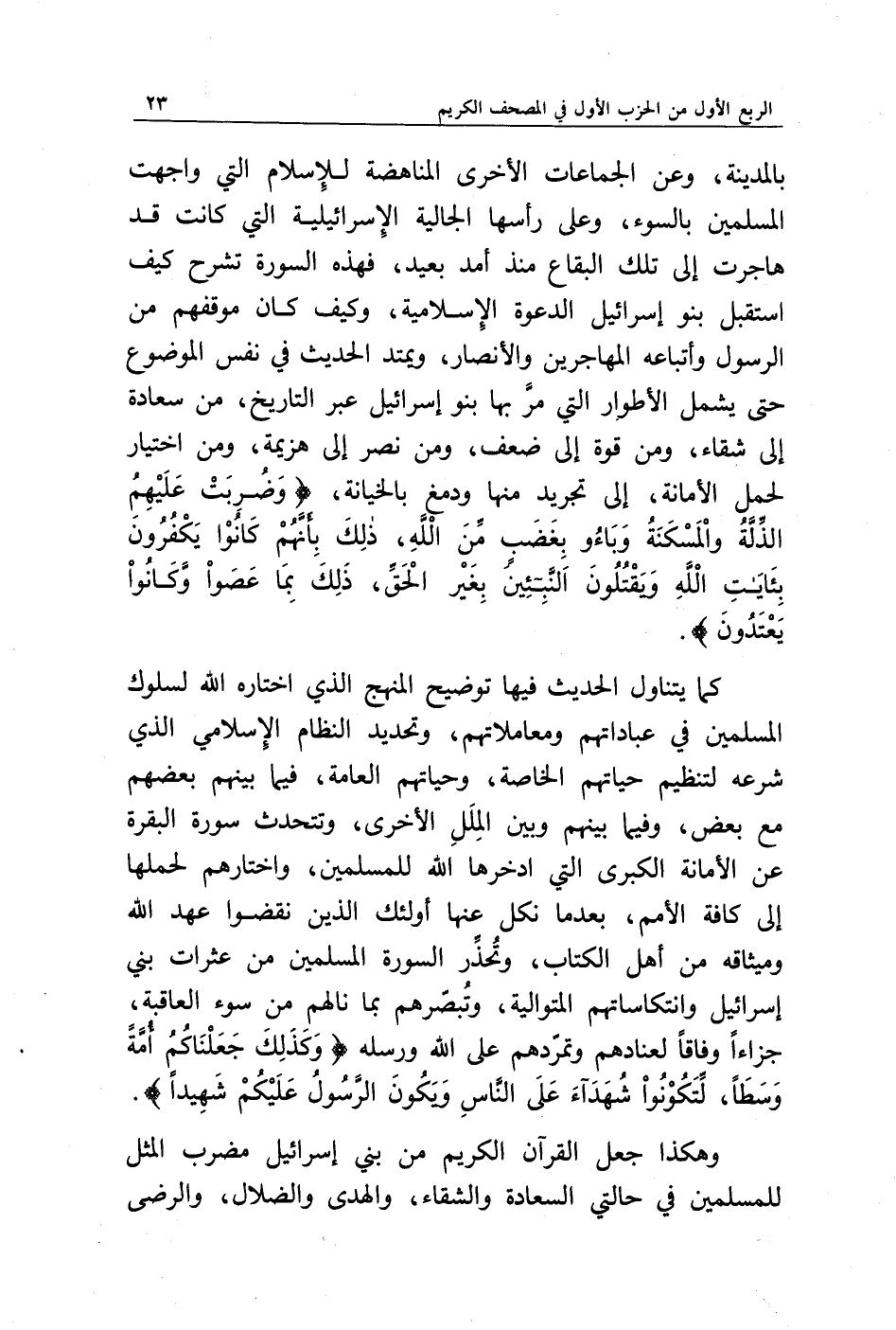بالمدينة، وعن الجماعات الأخرى المناهضة للإسلام التي واجهت المسلمين بالسوء، وعلى رأسها الجالية الإسرائيلية التي كانت قد هاجرت إلى تلك البقاع منذ أمد بعيد، فهذه السورة تشرح كيف استقبل بنو إسرائيل الدعوة الإسلامية، وكيف كان موقفهم من الرسول وأتباعه المهاجرين والأنصار، ويمتد الحديث في نفس الموضوع حتى يشمل الأطوار التي مر بها بنو إسرائيل عبر التاريخ، من سعادة إلى شقاء، ومن قوة إلى ضعف، ومن نصر إلى هزيمة، ومن اختيار لحمل الأمانة، إلى تجريد منها ودمغ بالخيانة، {وَضُرِبَتْ عَلَيْهِمُ الذِّلَّةُ وَالْمَسْكَنَةُ وَبَاءُوا بِغَضَبٍ مِنَ اللَّهِ ذَلِكَ بِأَنَّهُمْ كَانُوا يَكْفُرُونَ بِآيَاتِ اللَّهِ وَيَقْتُلُونَ النَّبِيِّينَ بِغَيْرِ الْحَقِّ ذَلِكَ بِمَا عَصَوْا وَكَانُوا يَعْتَدُونَ}.