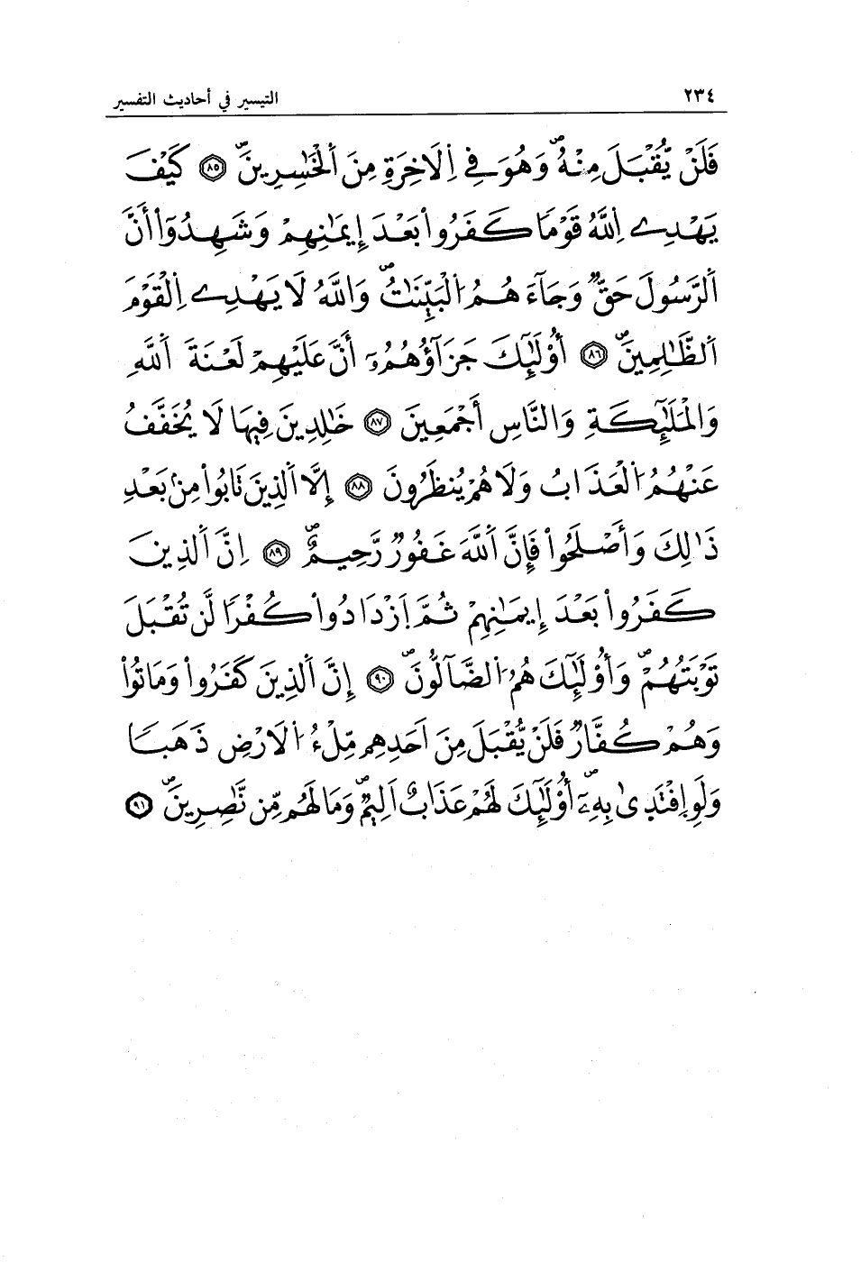 فَلَنْ يُقْبَلَ مِنْهُ وَهُوَ فِي الْآخِرَةِ مِنَ الْخَاسِرِينَ (85) كَيْفَ يَهْدِي اللَّهُ قَوْمًا كَفَرُوا بَعْدَ إِيمَانِهِمْ وَشَهِدُوا أَنَّ الرَّسُولَ حَقٌّ وَجَاءَهُمُ الْبَيِّنَاتُ وَاللَّهُ لَا يَهْدِي الْقَوْمَ الظَّالِمِينَ (86) أُولَئِكَ جَزَاؤُهُمْ أَنَّ عَلَيْهِمْ لَعْنَةَ اللَّهِ وَالْمَلَائِكَةِ وَالنَّاسِ أَجْمَعِينَ (87) خَالِدِينَ فِيهَا لَا يُخَفَّفُ عَنْهُمُ الْعَذَابُ وَلَا هُمْ يُنْظَرُونَ (88) إِلَّا الَّذِينَ تَابُوا مِنْ بَعْدِ ذَلِكَ وَأَصْلَحُوا فَإِنَّ اللَّهَ غَفُورٌ رَحِيمٌ (89) إِنَّ الَّذِينَ كَفَرُوا بَعْدَ إِيمَانِهِمْ ثُمَّ ازْدَادُوا كُفْرًا لَنْ تُقْبَلَ تَوْبَتُهُمْ وَأُولَئِكَ هُمُ الضَّالُّونَ (90) إِنَّ الَّذِينَ كَفَرُوا وَمَاتُوا وَهُمْ كُفَّارٌ فَلَنْ يُقْبَلَ مِنْ أَحَدِهِمْ مِلْءُ الْأَرْضِ ذَهَبًا وَلَوِ افْتَدَى بِهِ أُولَئِكَ لَهُمْ عَذَابٌ أَلِيمٌ وَمَا لَهُمْ مِنْ نَاصِرِينَ (91)