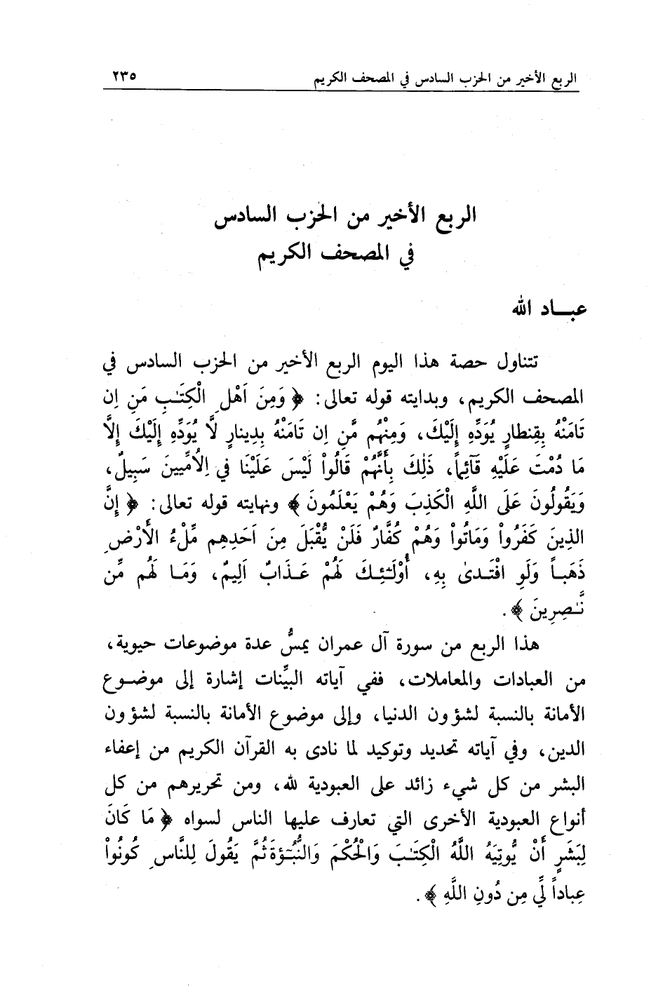 تتناول حصة هذا اليوم الربع الأخير من الحزب السادس في المصحف الكريم، وبدايته قوله تعالى: {وَمِنْ أَهْلِ الْكِتَابِ مَنْ إِنْ تَأْمَنْهُ بِقِنْطَارٍ يُؤَدِّهِ إِلَيْكَ وَمِنْهُمْ مَنْ إِنْ تَأْمَنْهُ بِدِينَارٍ لَا يُؤَدِّهِ إِلَيْكَ إِلَّا مَا دُمْتَ عَلَيْهِ قَائِمًا ذَلِكَ بِأَنَّهُمْ قَالُوا لَيْسَ عَلَيْنَا فِي الْأُمِّيِّينَ سَبِيلٌ وَيَقُولُونَ عَلَى اللَّهِ الْكَذِبَ وَهُمْ يَعْلَمُونَ} ونهايته قوله تعالى: {إِنَّ الَّذِينَ كَفَرُوا وَمَاتُوا وَهُمْ كُفَّارٌ فَلَنْ يُقْبَلَ مِنْ أَحَدِهِمْ مِلْءُ الْأَرْضِ ذَهَبًا وَلَوِ افْتَدَى بِهِ أُولَئِكَ لَهُمْ عَذَابٌ أَلِيمٌ وَمَا لَهُمْ مِنْ نَاصِرِينَ}.