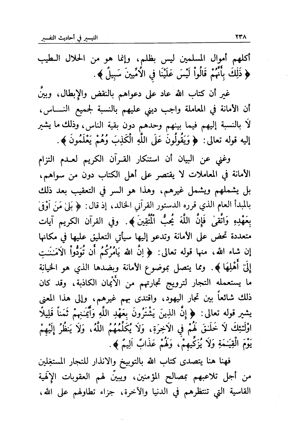 وغني عن البيان أن استنكار القرآن الكريم لعدم التزام الأمانة في المعاملات لا يقتصر على أهل الكتاب دون من سواهم، بل يشملهم ويشمل غيرهم، وهذا هو السر في التعقيب بعد ذلك بالمبدأ العام الذي قرره الدستور القرآني الخالد، إذ قال {بَلَى مَنْ أَوْفَى بِعَهْدِهِ وَاتَّقَى فَإِنَّ اللَّهَ يُحِبُّ الْمُتَّقِينَ} وفي القرآن الكريم آيات متعددة تحض على الأمانة وتدعو إليها سيأتي التعليق عليها في مكانها إن شاء الله، منها قوله تعالى: {إِنَّ اللَّهَ يَأْمُرُكُمْ أَنْ تُؤَدُّوا الْأَمَانَاتِ إِلَى أَهْلِهَا}. ومما يتصل بموضوع الأمانة وبضدها الذي هو الخيانة ما يستعمله التجار لترويج تجارتهم من الأيمان الكاذبة، وقد كان ذلك شائعا بين تجار اليهود، واقتدى بهم غيرهم، وإلى هذا المعنى يشير قوله تعالى: {إِنَّ الَّذِينَ يَشْتَرُونَ بِعَهْدِ اللَّهِ وَأَيْمَانِهِمْ ثَمَنًا قَلِيلًا أُولَئِكَ لَا خَلَاقَ لَهُمْ فِي الْآخِرَةِ وَلَا يُكَلِّمُهُمُ اللَّهُ وَلَا يَنْظُرُ إِلَيْهِمْ يَوْمَ الْقِيَامَةِ وَلَا يُزَكِّيهِمْ وَلَهُمْ عَذَابٌ أَلِيمٌ}.